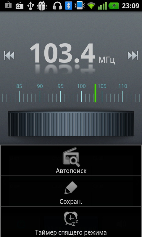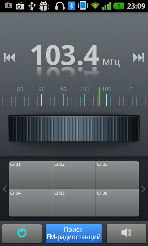 Коммуникатор поступил в редакцию без гарнитуры, так что о её виде и качестве ничего определённого сказать нельзя. Однако именно она (или любые другие наушники) требуется для работы встроенного FM-радиоприёмника. Внешний вид программы управления радиоприёмником лаконичен. Можно выполнить быстрый поиск станции в ручном или автоматическом режимах, а затем добавить частоту в память коммуникатора.