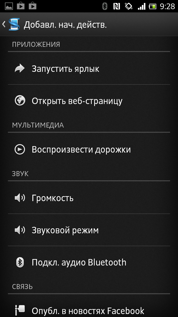 В качестве условия можно использовать опознание метки или подключение устройства, дополнительно можно ограничить время работы схемы. Набор действий достаточно широкий, в него входят запуск приложения, открытие ссылки в браузере, запуск музыки, регулировка громкости и режима, подключение аудиоустройства Bluetooth, отправка SMS, звонок, управление беспроводными интерфейсами, регулировка яркости и другие действия. Причем их же можно назначить и на выход из данного режима, который осуществляется по повторному опознаванию метки, по новому событию/метке или по истечению указанного временно́го интервала.
