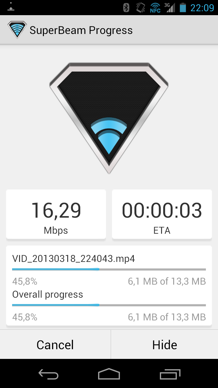 Еще более высокую скорость показала утилита SuperBeam WiFi Direct Share. Она менее универсальна, чем File Expert HD, однако способна обеспечить соединение по Wi-Fi, даже если у устройств нет поддержки Wi-Fi Direct. А скорость передачи составила в наших тестах около 2 МБ/с, что уже очень неплохо. Таким образом даже видеоролики в несколько десятков мегабайт можно будет перенести за разумное время. Как и ранее, NFC используется здесь только для начальной настройки соединения устройств. Поддерживается передача любых типов файлов. Утилита встраивается в стандартное меню приложений «поделиться».