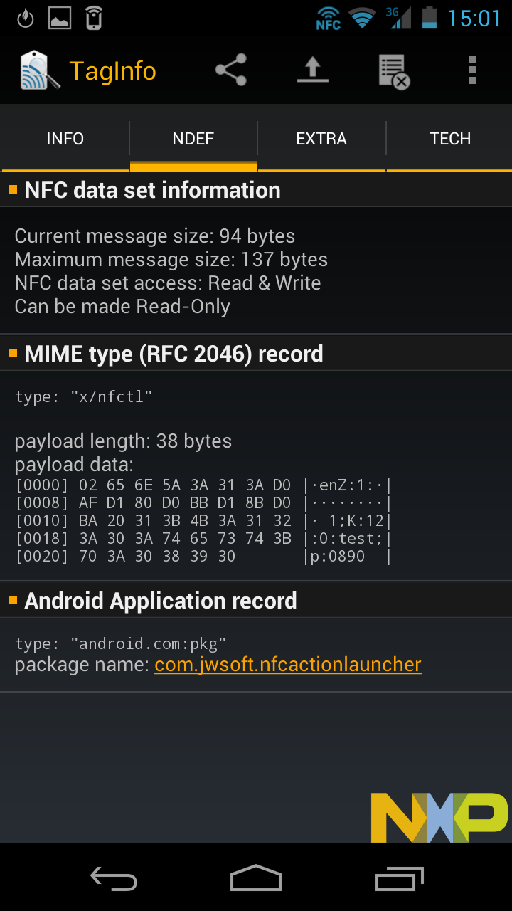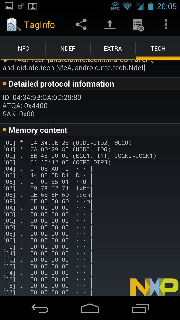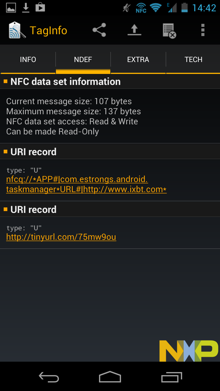 Если же говорить про собственноручное изготовление меток, то и это вполне осуществимый сценарий. Для этого нужно приобрести чистые заготовки и с использованием специальной программы для телефона записать на них требуемую информацию. Для примера мы купили несколько разных вариантов: наклейку минимальной толщины, защищенный кружочек из пластика и брелки. Все они имели совсем небольшой объем памяти — всего 144 байта (на рынке присутствуют варианты и на 4 КБ). Число циклов перезаписи указано не было, но для большинства сценариев применения этот параметр не критичен. Для работы с метками можно рекомендовать программы NXP Semiconductors — TagInfo и TagWriter.