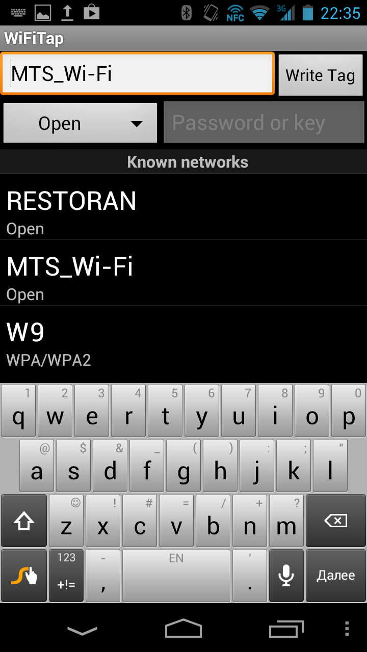 - WifiTap WiFi NFC: позволяет записать метку для подключения к беспроводной сети. Фактически она представляет собой текстовую ссылку (URI) вида wifi://ssid/wpa/key. Ее можно использовать для быстрого подключения гостей к вашей домашней точке доступа без ввода сложных и длинных паролей на клавиатуре телефона. Клиенту достаточно лишь считать метку, и в его телефон будет записана новая точка доступа.