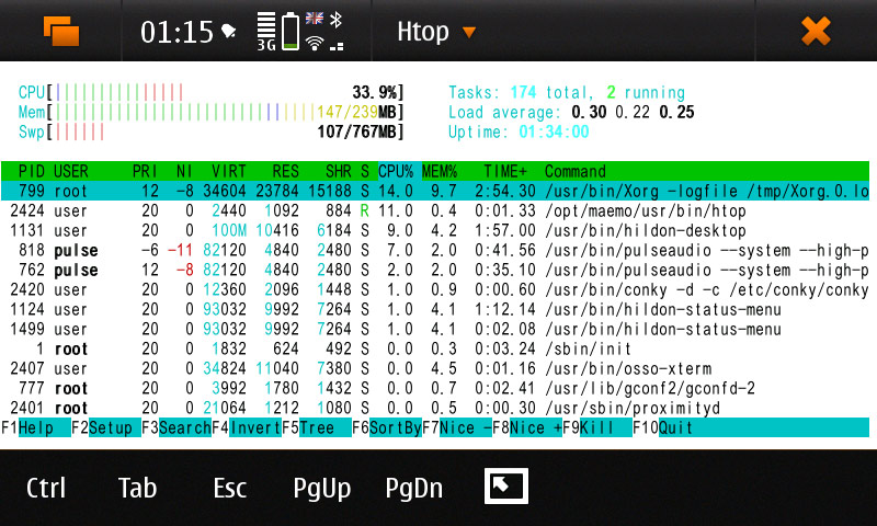 Передача файлов по SSH (на ПК SSH инициирован с FAR) удавалась следующим образом: постоянное значение колебалось около 600 KiB/s, максимум — около 650 KiB/s, процессор при этом почти всегда работает на 500 MHz, sshd грузит его процентов на 20-30, если при этом что-то начинает ещё загружать телефон, например, входящий звонок, то проц включается на 600 MHz, загрузка возрастает до 100%, а скорость передачи падает всемеро, до 80-90 KiB/s.
