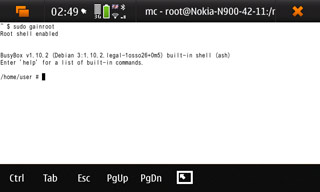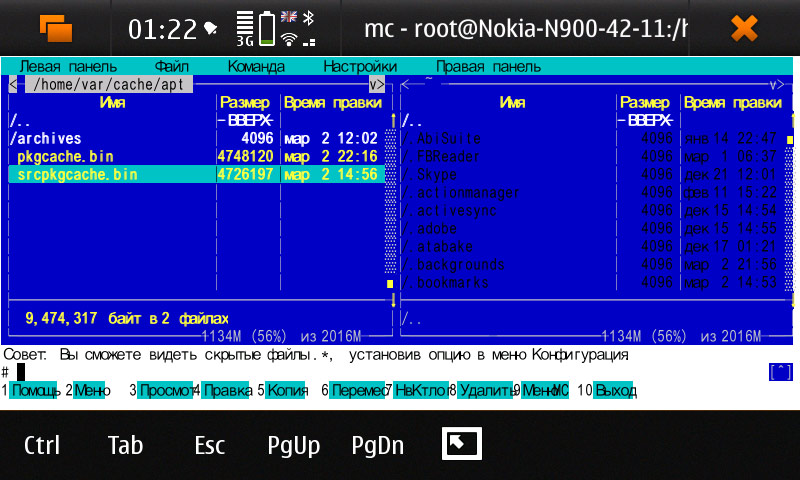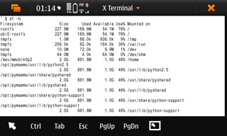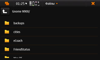 В Nokia N900 «из коробки» установлены файловый менеджер и терминальная программа X Terminal. Родной файловый менеджер справляется лишь с задачей просмотра содержимого директории /home/user/MyDocs, которой достаточно для того, чтобы следить за музыкой, фильмами, документами и ещё парой вещей. То есть, это тот самый раздел, размер которого составляет 32 ГБ. Если хочется чего-то более внушительного, следует или пользоваться командной строкой в терминалке, или ставить MC (Midnight Commander), или один из двух других файловых менеджеров. Вот все вчетвером они справляются с задачами, а хотелось бы иметь какой-то один.