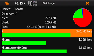 Начнём с устройства файловой системы, которое подкинуло достаточное количество проблем как разработчикам ПО, так и пользователям. Например, раздел rootfs здесь имеет размер всего в 227 МБ, из которых после включения нескольких каталогов в «Диспетчере приложений» и установки небольшого количества программ пользователю останется около 10-20 МБ. Периодически дело доходило и до 5 МБ, и до 0 МБ, после чего аппарат начинал весьма некрасиво себя вести, и если не знать, как с этим бороться, можно очень и очень расстроиться.