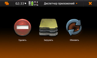 «Диспетчер» состоит из трёх разделов: установленные, список приложений, список обновлений. Основное негодяйство — очень неудобно включать/выключать репозитории, а если их много, «Диспетчер приложений» даже через WiFi работает неприлично долго. Вторая составляющая неудобства — список приложений отсортирован по разделам, и пересортировать его по репозиториям нельзя. Информация же о том, из какого каталога было установлено приложение, доступна лишь перед установкой, а после — этот пункт исчезает из описания программы.