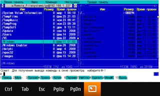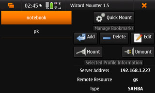 В принципе, и программы, по смыслу аналогичные упомянутой SymSMB для S60, тоже стали появляться. Есть, например, Wizard Mounter, позволяющий монтировать удалённые диски по протоколам Samba (винды) и NFS (для линукса). Проблемы, правда, пока есть, да и скорости отнюдь не впечатляющие. Фильм посмотреть не удалось. Копирование — при отсутствии других серьёзных задач — порядка 100-300 КБ/с. Подмонтировал сразу два компьютера, и при копировании с одного на другой скорость около 60-100 КБ/с. Вот что не понравилось: при событиях, отвлекающих аппарат от такой работы, например, входящем звонке, скорость весьма заметно падает, а восстанавливается потом очень долго.