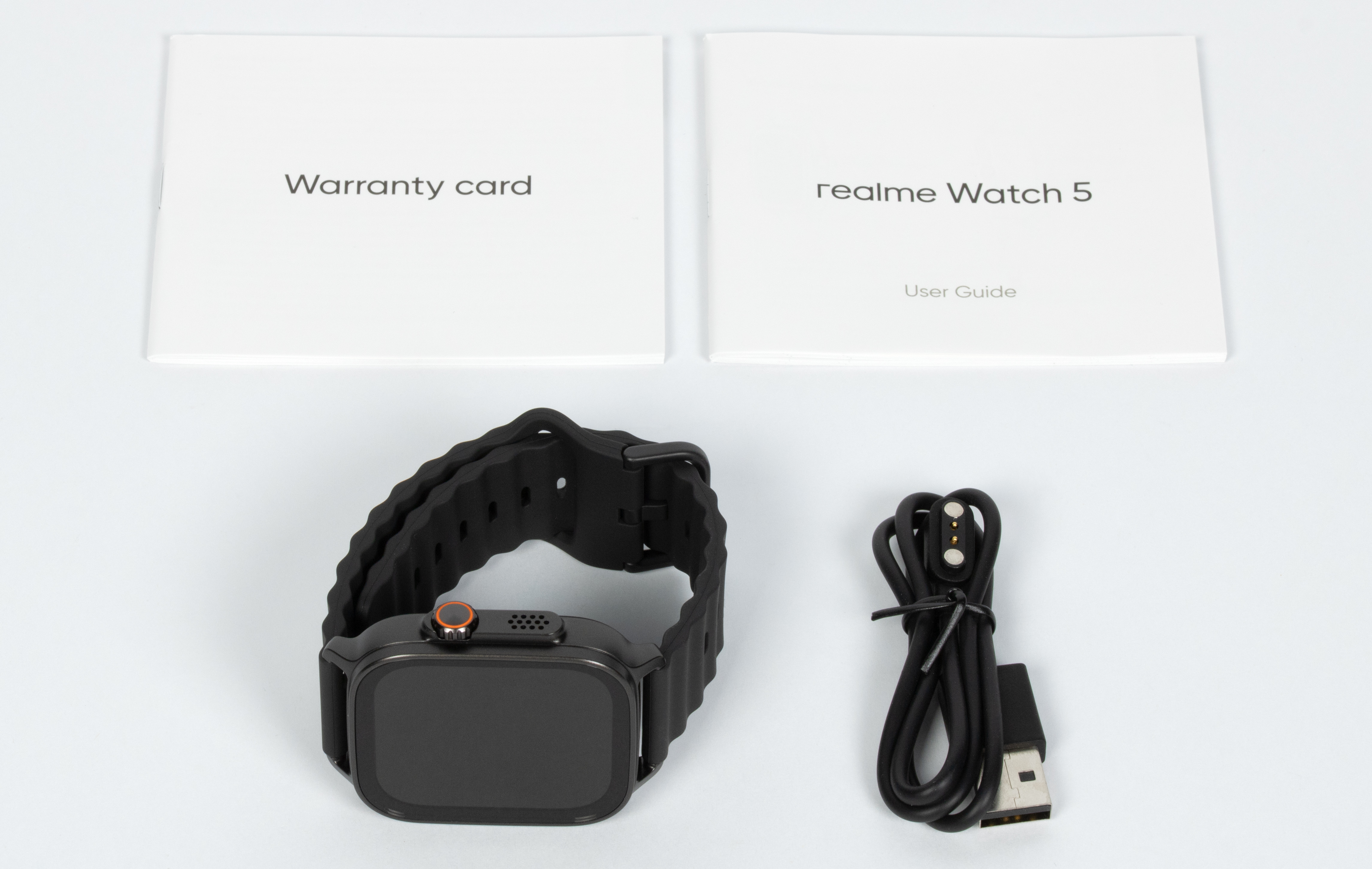 Комплектация включает крошечный буклет «Краткое руководство пользователя», гарантийный талон, а также зарядный кабель со штекером USB-A на одном конце и магнитным коннектором с двумя контактами на другом.
