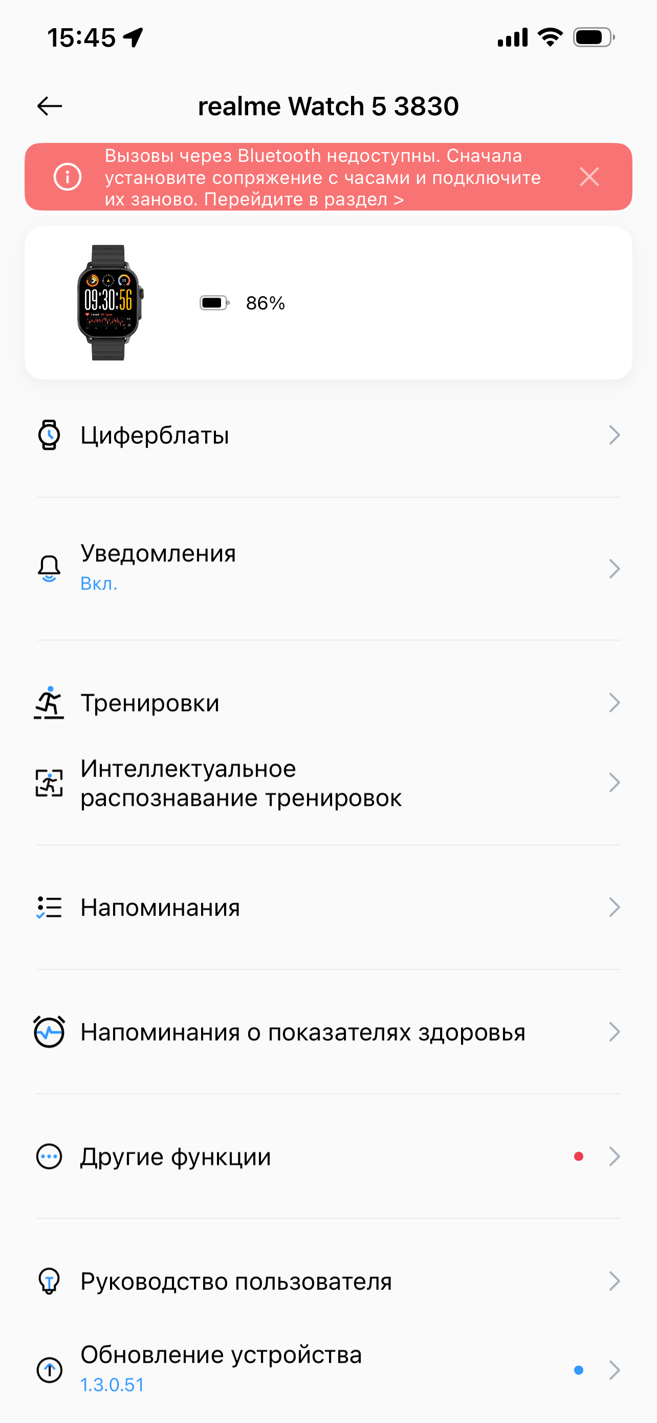 Странную неполадку мы заметили при первом подключении. Появилась надпись «Вызовы через Bluetooth недоступны. Сначала установите сопряжение с часами и подключите их заново. Перейдите в раздел >».