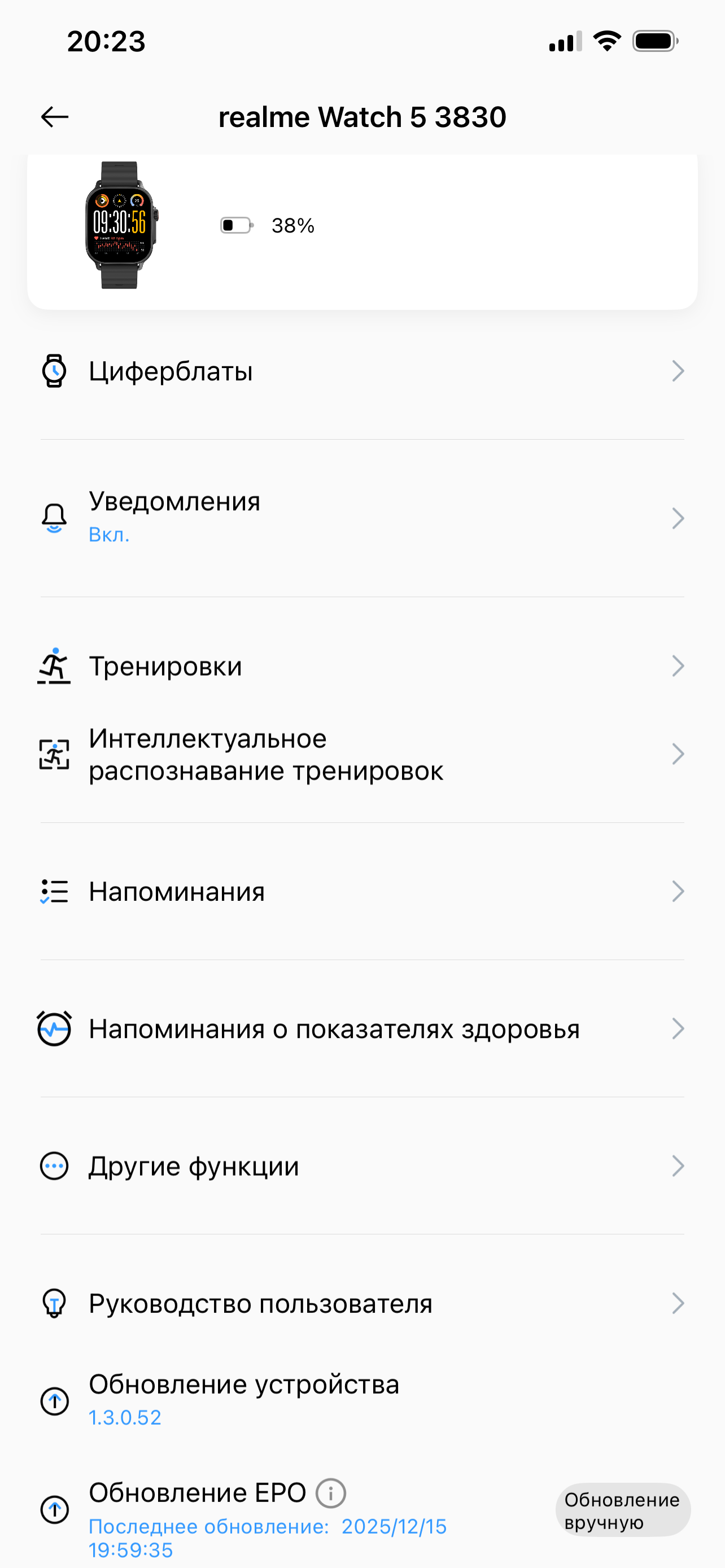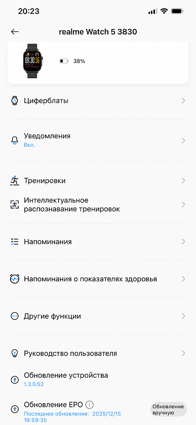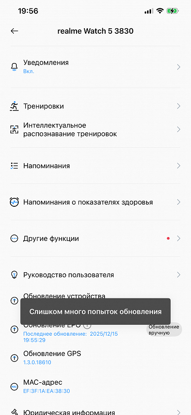 Вообще при изучении ПО, связанного с часами Realme, есть ощущение некоторой сырости. Например, при первом же нажатии на Обновление EPO (это нужно для точности позиционирования по GPS) мы получили сообщение «Слишком много попыток обновления», но буквально через 10 минут та же операция оказалась успешной. Далее, внизу настроек есть пугающая иконка «Устройство удалено», но это уже кривость перевода. Имеется в виду, конечно, «Удалить устройство». Все — вроде бы мелочи, но вместе они и формируют впечатление, что перед нами некая ранняя бета-версия, а не отшлифованный коммерческий продукт.