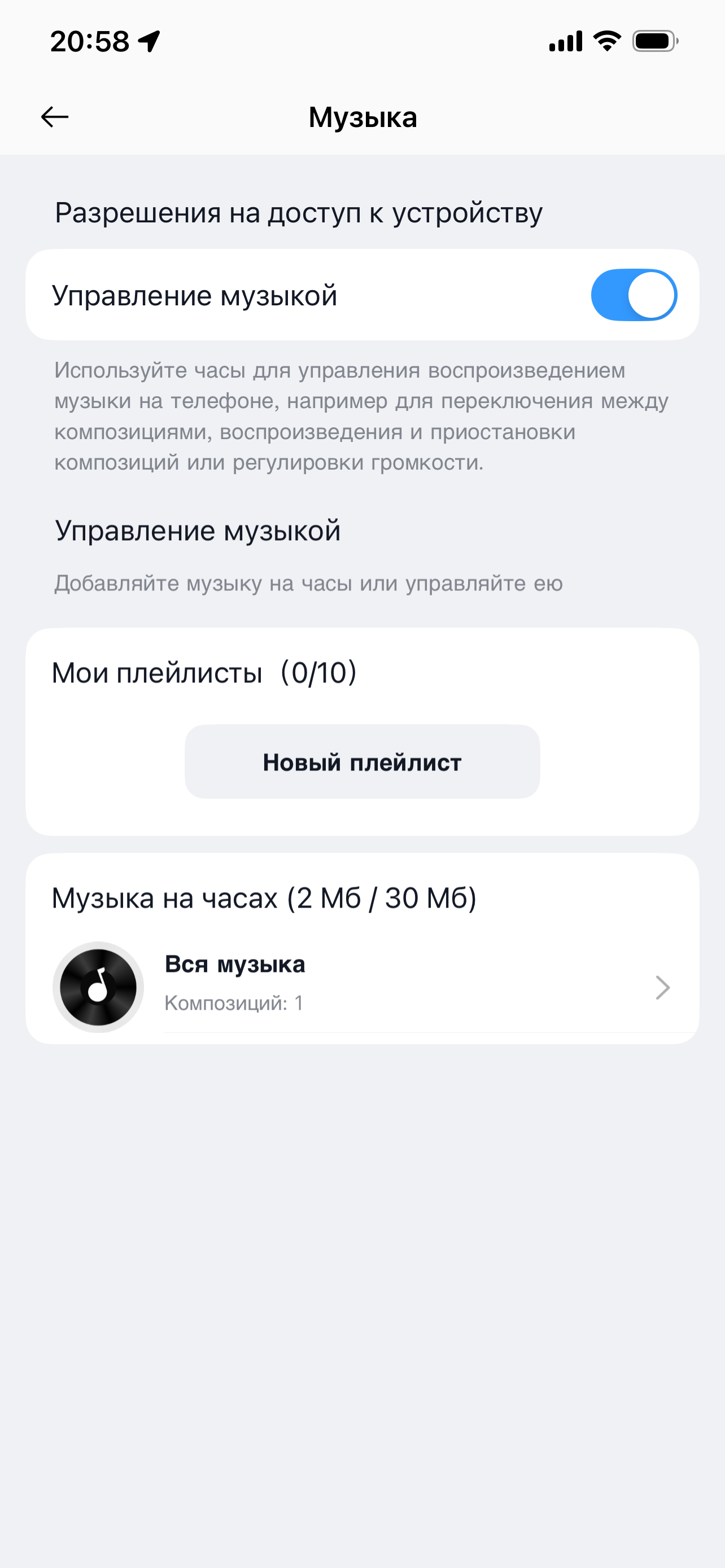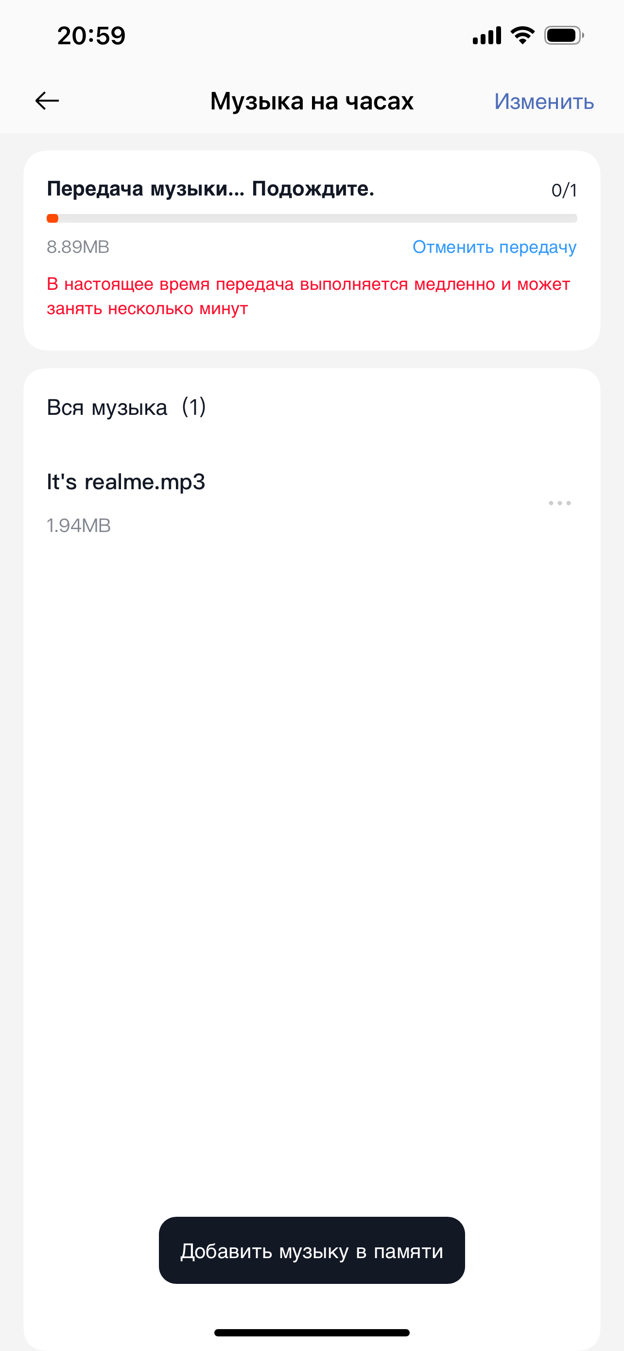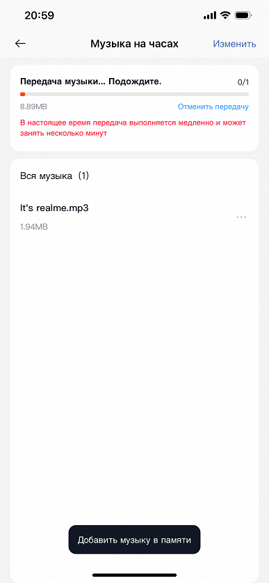 Нюанс этот заключается в том, что доступный объем памяти для загрузки музыки — всего 30 МБ, то есть на часы не влезет даже один полноценный альбом в MP3. Но мало того: вдобавок загрузка этого смешного объема происходит на редкость долго. Трек 12,35 МБ загрузился за 7 минут 52 секунды, что дает скорость передачи около 26,8 КБ/с. Для сравнения: скорость ИК-порта на Nokia 3310 (и многих других смартфонах той же эпохи) составляла 115 Кбит/с, то есть 14,3 КБ/с. Цифры, как видите, сопоставимые. В общем, если вы забыли ощущения при передаче трека по ИК-порту — есть хороший способ поностальгировать.