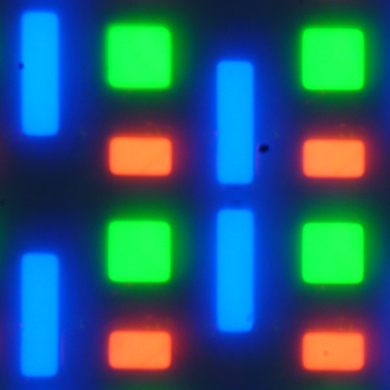 В этом экране используется OLED-матрица — активная матрица на органических светодиодах. Полноцветное изображение создается с помощью субпикселей трех цветов — красного (R), зеленого (G) и синего (B) в равном количестве, что подтверждается фрагментом микрофотографии: