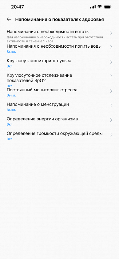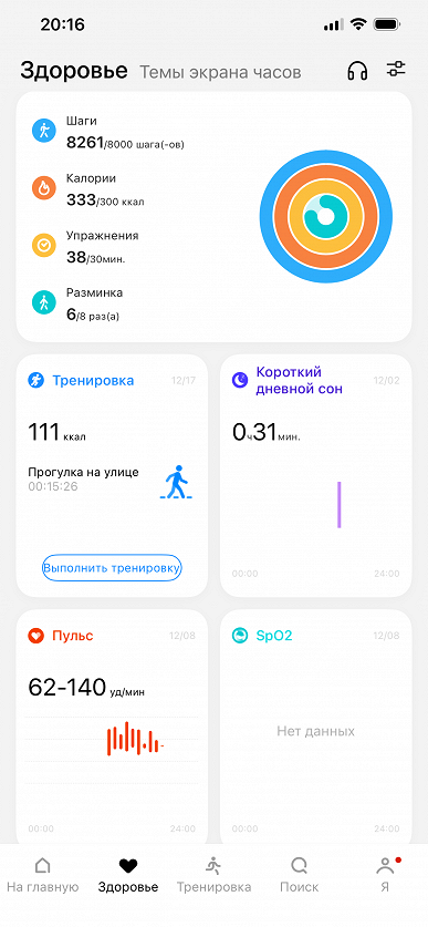 При этом, в целом интерфейс приложения традиционен: здесь есть страница устройства, страница «Здоровье» со сводками по всем основным показателям, почему-то там же, в «Здоровье», на отдельной вкладке доступны альтернативные циферблаты. Ну и третий пункт — «Тренировки» (имеются в виду те, что можно запустить непосредственно со смартфона).