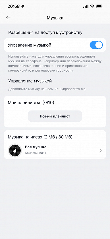 На что еще стоит обратить внимание? С помощью приложения «Музыка» можно управлять воспроизведением композиций на смартфоне, а можно загрузить треки напрямую на часы и прослушивать их, подключив к часам Bluetooth-гарнитуру. Такое мы видим не так уж часто: как правило, в устройстве реализовано или одно (управление музыкой), или другое (воспроизведение музыки). Но, опять же, есть нюанс.