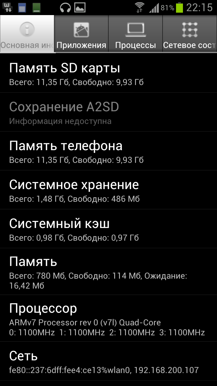 - Оперативная память 1 ГБ, основная флеш-память 2 ГБ (доступно 512 МБ), дополнительная флеш-память 16 ГБ (доступно 11,3 ГБ);