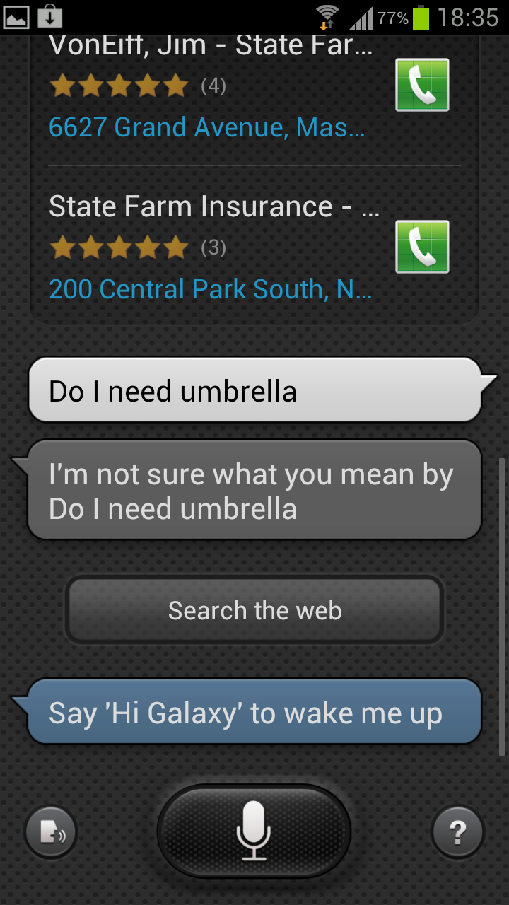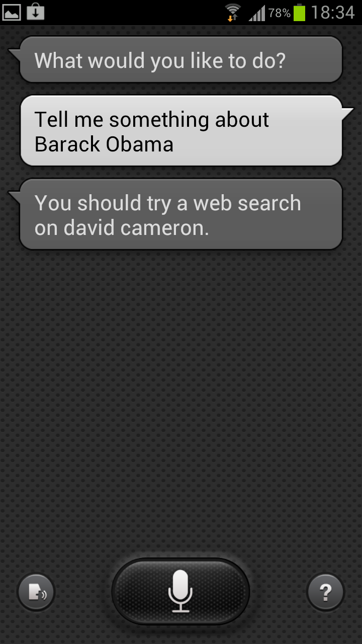 Запрос относительно акций Samsung помощник ретранслировал в поисковый запрос системе Google. В Samsung Galaxy S 3 нет полноценного приложения для работы с котировками (лишь виджет), так что можно считать этот вопрос обработанным верно. Вопрос о нынешнем президенте США не заставил S Voice запускать поисковик, верный ответ был дан через несколько секунд. Ответ на просьбу рассказать что-нибудь о Бараке Обаме оказался совершенно неожиданным: S Voice почему-то предложила поискать в интернете информацию о британском премьер-министре. Учитывая, что Siri на этот вопрос вообще ничего не ответила, можно считать S Voice более продвинутой программой с точки зрения абстрактной логики. Запрос информации о банках города Нью-Йорк обработался неверно — вероятно, из-за ошибки в самой фразе. Вопрос, нужен ли мне зонтик, остался, к сожалению, без ответа — второй проигрыш S Voice конкуренту.