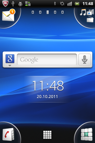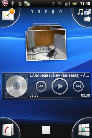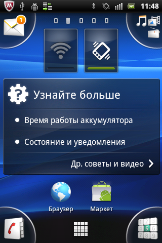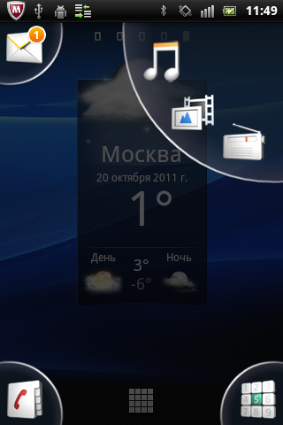Вкладок на основном экране коммуникатора пять, на них, как обычно, можно размещать виджеты и ярлыки приложений, которым не хватило места в угловых группах. Стандартный набор виджетов включает: часы, поиск Google, советы, выключатели Wi-Fi и динамиков, почтовый клиент Moxier, совмещенный с антивирусом McAfee, галерею, аудиоплеер и, самое важное, прогноз погоды.