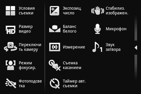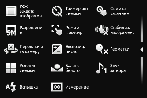 Настройки и инструменты управления камерой скомпонованы на экране несколько необычно. В правой части дисплея находятся эскизы только что полученных фотографий. Потянув за эту панель, можно раскрыть окно с полной галереей снимков. С другой стороны экрана находятся значки наиболее используемых настроек: режим захвата изображения (например, распознавание улыбки), разрешение снимков, переключение между основной и дополнительной камерами, условия съёмки (пейзаж, портрет, ночная съёмка, спорт и так далее), режим работы вспышки. Аналогично, потянув за панель, можно открыть окно с остальными настройками камеры. Среди них находятся: баланс белого, таймер, режим фокусировки, коррекция экспозиции, стабилизация изображения, съёмка касанием и другие.