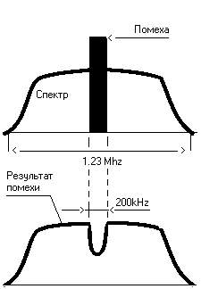 CDMA называют широкополосной системой и сигналы идущие в эфире шумоподобными. Широкополосная - потому, что занимает широкую полосу частот. Шумоподобные сигналы - потому, что когда в эфире на одной частоте, в одно и то же время работают несколько абонентов, сигналы накладываются друг на друга (можно представить шум в ресторане, когда все одновременно говорят). Помехоустойчивая - потому, что при возникновении в широкой полосе частот(1,23 Мгц) сигнала-помехи, узкого диапазона (<150кГц), сигнал примется почти неискаженный. За счет помехоустойчивого кодирования потерянные данные система восстановит, см. рис 1, где показан полезный сигнал и помеха (СЗС - селективная помеха).