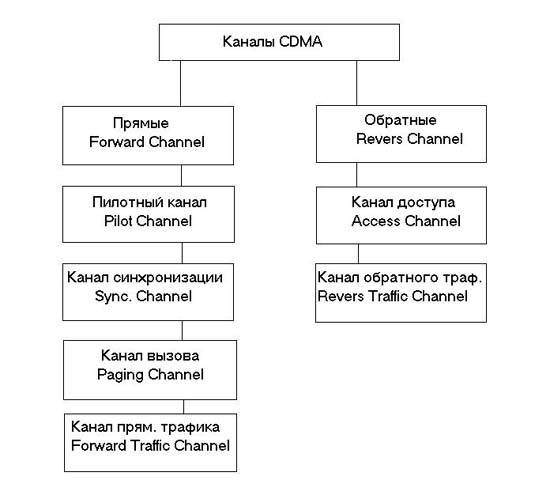 В CDMA каналы для передачи с базовой станции называются прямыми (Forward), для приема базовой станцией - обратными (Reverse). Структура каналов в CDMA в стандарте IS-95 показана на рис: