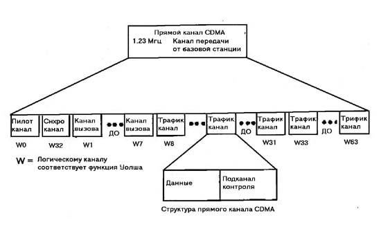 Каждому логическому каналу назначается свой код Уолша. Всего в одном физическом канале логических каналов может быть 64, т.к. последовательностей Уолша, которым в соответствие ставятся логические каналы, всего 64, каждая из которых имеет длину по 64 бита. Из всех 64 каналов на 1-й канал назначается первый код Уолша (W0) которому соответствует "Пилотный канал", на следующий канал назначается тридцать второй код Уолша (W32), следующим 7-ми каналам так же назначаются свои коды Уолша (W1,W2,W3,W4,W5,W6,W7) которым соответствуют каналы вызова, и оставшиеся 55 каналов предназначены для передачи данных по "Каналу прямого трафика".