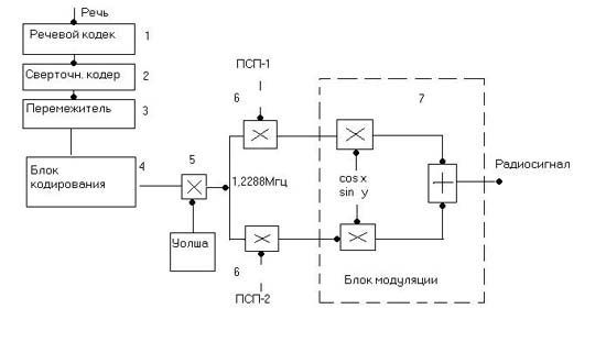 На этом этапе кодирования сигнала происходит расширение спектра частот, т.е. каждый бит информации кодируется последовательностью, построенной по функции Уолша, длиной 64 бита. Т.о. скорость потока данных в канале увеличивается в 64 раза. Следовательно, в блоке модуляции сигнала скорость манипуляции сигнала возрастает, отсюда и расширение спектра частот.