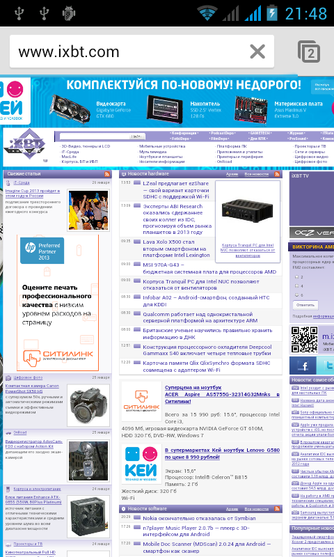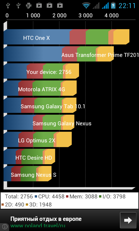 Ожидания оправдались, результаты оказались ровно такими, какими они должны были быть. Производительность чипов примерно одинакова у всех устройств с MediaTek MTK6577, а это: Jiayu G3, iconBIT NetTAB Mercury X, Fly IQ441. Оценка графической подсистемы сильно зависит от разрешения дисплея — чем оно больше, тем труднее обрабатывать картинку на экране и тем, соответственно, ниже производительность и ее оценка. Поэтому нет ничего удивительного в том факте, что герой обзора опередил в этом тесте коммуникаторы с HD-дисплеями, в итоге получив более высокую общую оценку.