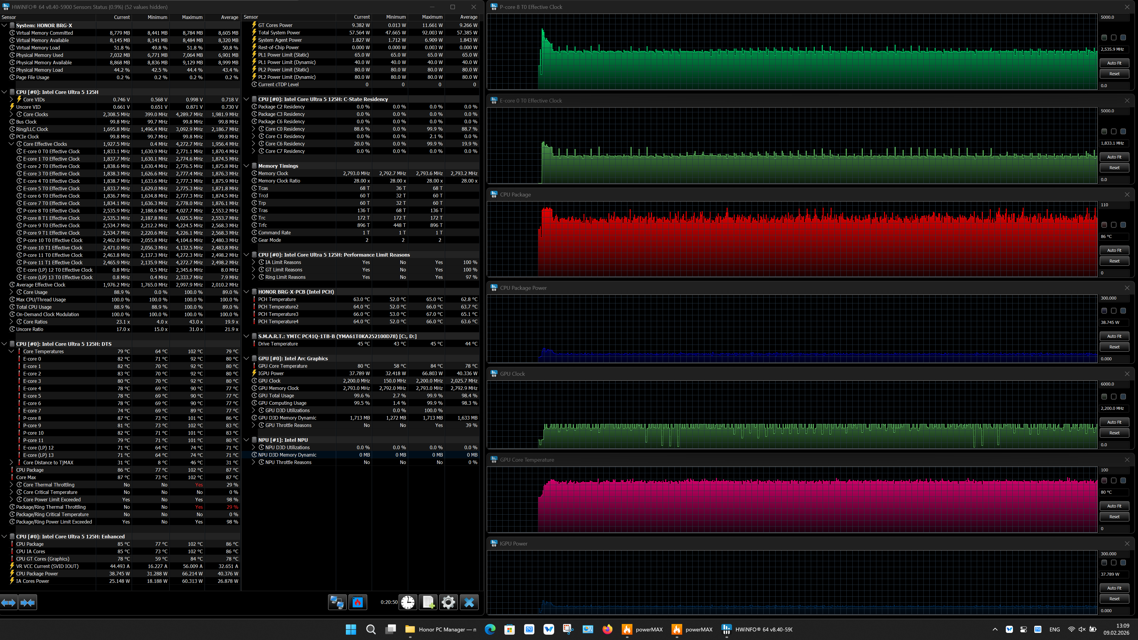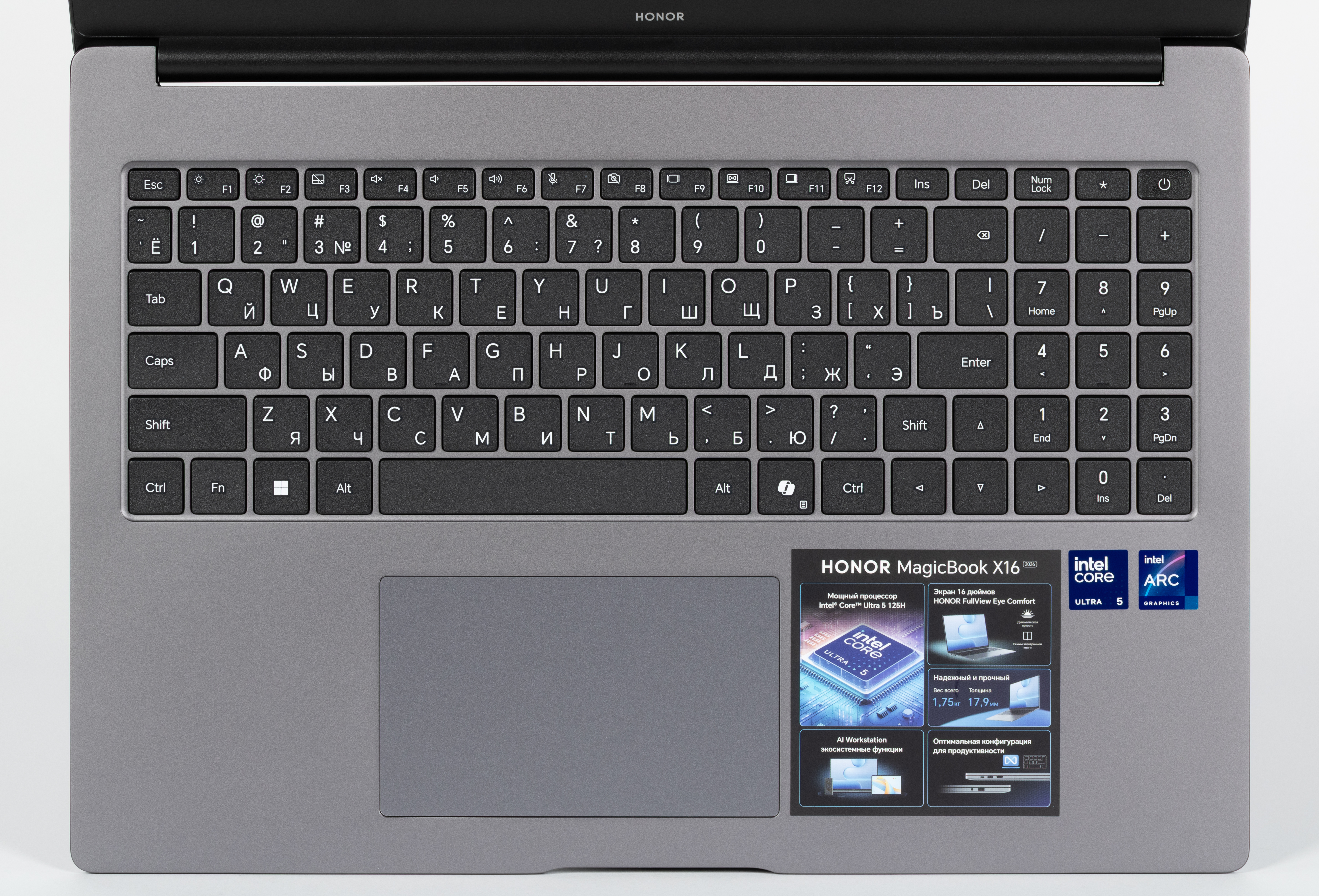 Honor MagicBook X16 2026 оснащается мобильным процессором Intel Core Ultra 5 125H (Meteor Lake-H), который отличается структурным подобием смартфонно-планшетным вычислительным однокристальным системам (System-on-Chip, SoC). В его составе имеется нейронный блок (NPU), позволяющий проводить вычисления с задействованием искусственного интеллекта. TDP процессора составляет 20—28 Вт в стабильном режиме и до 115 Вт при разгоне. Максимальная рабочая температура — 110 °C.