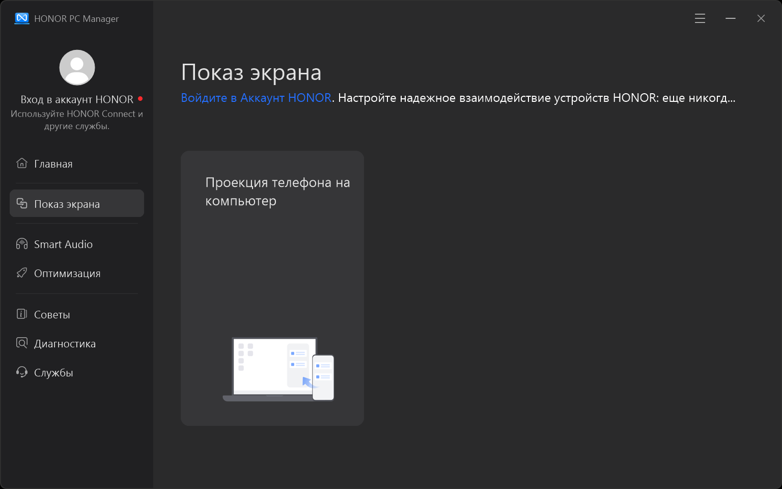 Раздел «Показ экрана» предлагает возможности проекции телефона на компьютер, компьютера на телефон или планшет и ПК на телевизор.