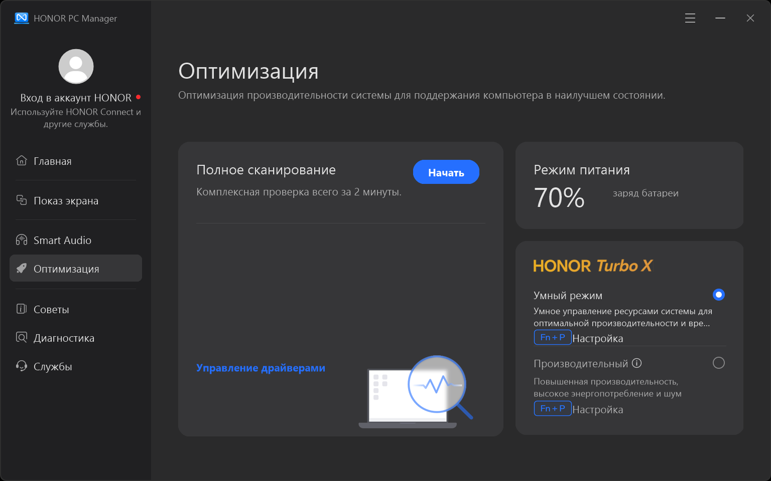 В разделе «Оптимизация» можно реализовать тюнинг системы для обеспечения наиболее выгодного режима работы. Здесь же можно выбрать один из двух доступных режимов работы: «Умный» или производительный. Без обращения к приложению переключение осуществляется при помощи клавиатурного аккорда Fn+P.
