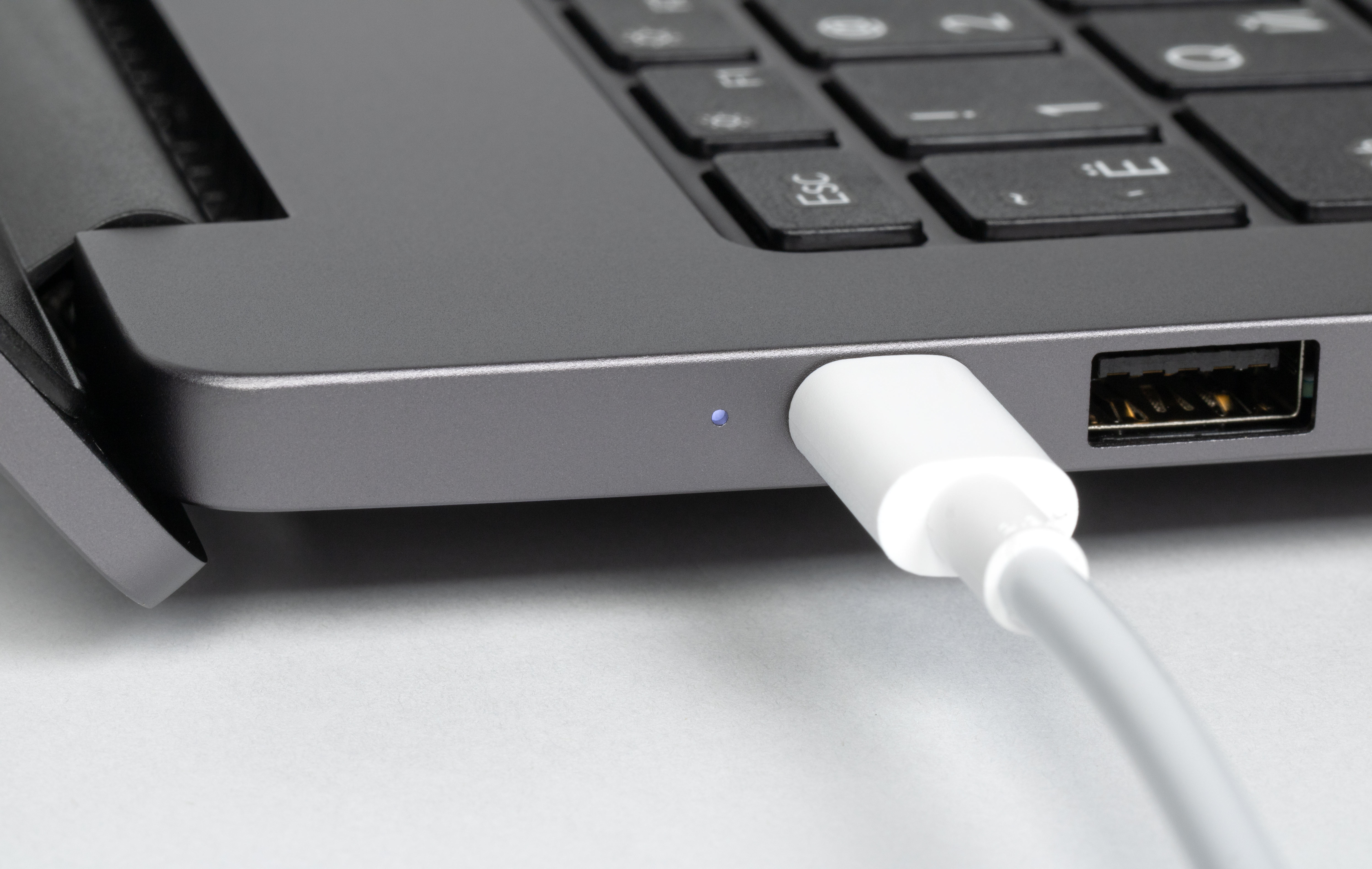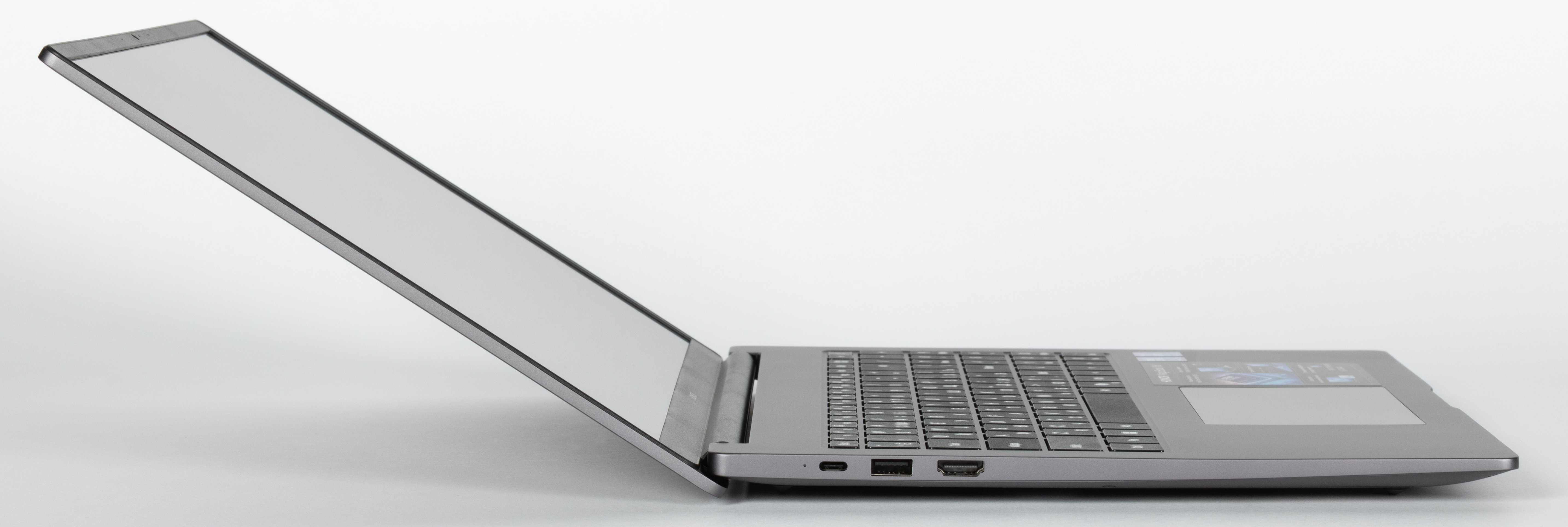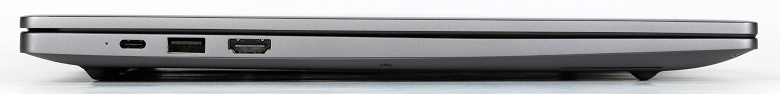 На левой боковой панели расположены светодиодный индикатор состояния батареи, порт USB 3.2 Gen1 Type A и видеовыход HDMI.