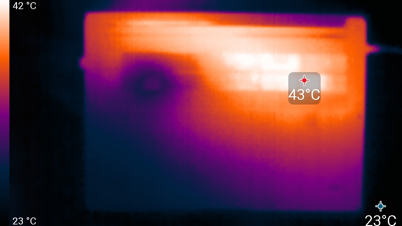 Внешняя поверхность матрицы черная жесткая и полуматовая (зеркальность хорошо выражена). Какие-либо специальные антибликовые покрытия или фильтр отсутствуют, нет и воздушного промежутка. При питании от сети или от батареи и при ручном управлении яркостью (автоматической подстройки по датчику освещенности нет) ее максимальное значение составило 330 кд/м² (в центре экрана на белом фоне). Если избегать прямого солнечного света, то такое значение позволяет как-то использовать ноутбук на улице даже летним солнечным днем.