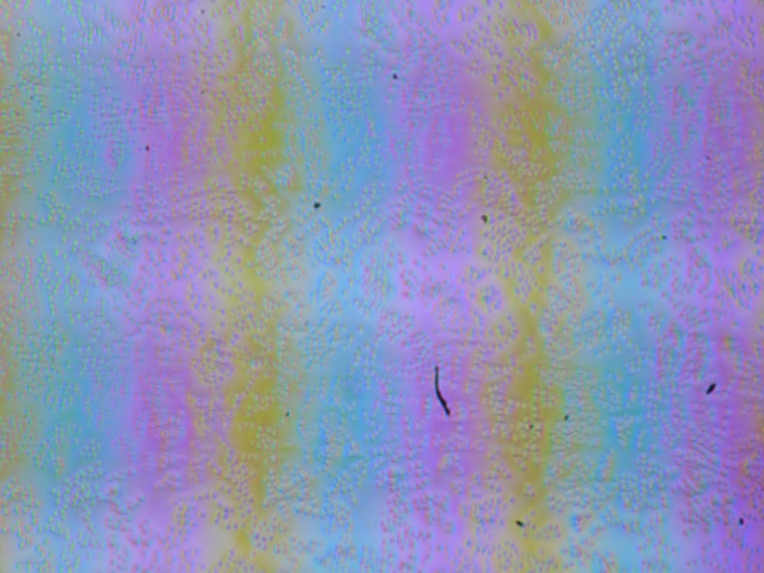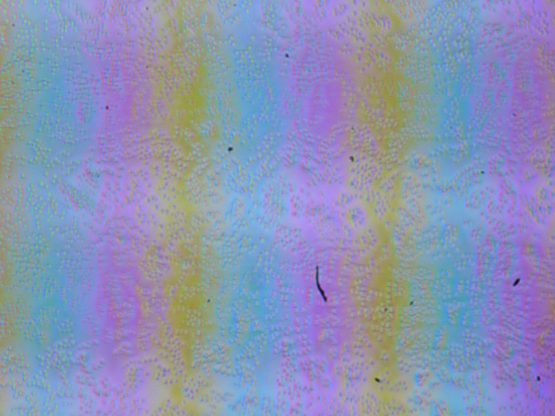 Зерно этих дефектов в несколько раз меньше размеров субпикселей (масштаб этих двух фотографий примерно одинаковый), поэтому фокусировка на микродефектах и «перескок» фокуса по субпикселям при изменении угла зрения выражены слабо, из-за этого нет и «кристаллического» эффекта.