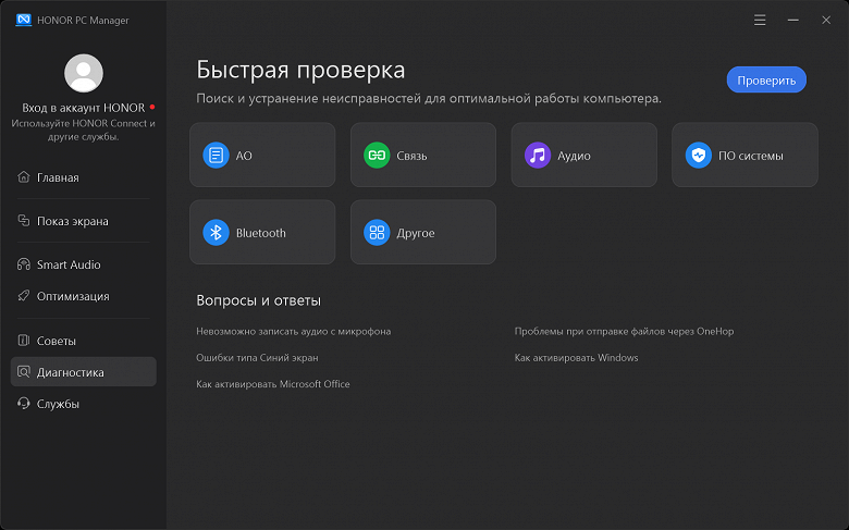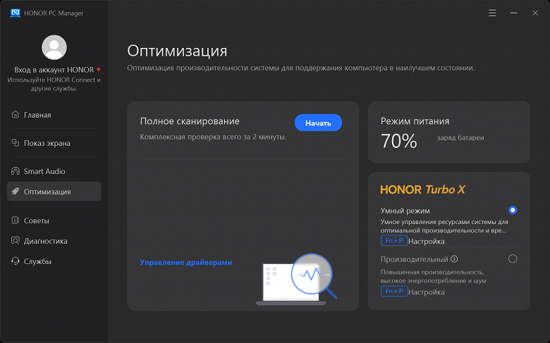 Фирменная утилита Honor PC Manager представляет наибольшую ценность при испытаниях машины, поскольку дает возможность настраивать разные параметры и выбирать сценарии (профили, пресеты) работы с разными уровнями производительности.