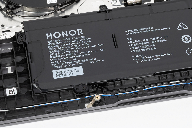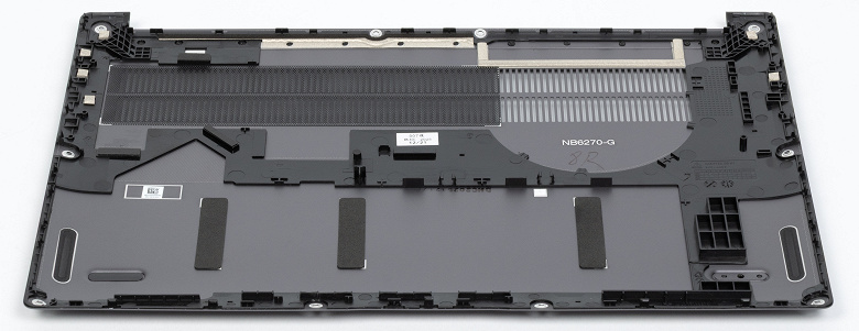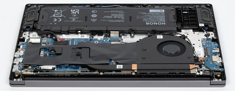 Внутри по размерам доминируют система охлаждения и аккумулятор. Теплосъемный агрегат вместе с теплотрубками заклеен. Аппаратная модернизация предусматривает возможность замены лишь аккумулятора, поскольку нет ни свободных слотов для дополнительных накопителей, ни возможности извлечь адаптер беспроводной связи.