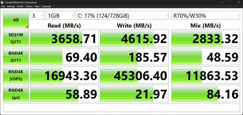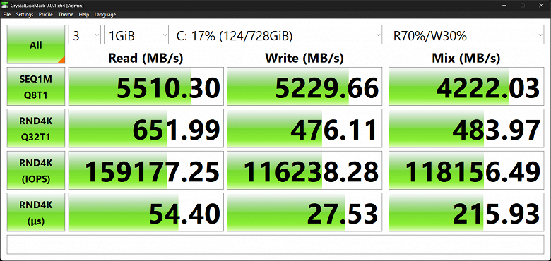 Отчет популярной утилиты CrystalDiskMark сообщает нижеследующее: