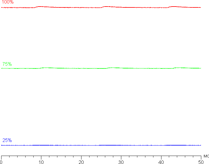 На любом уровне яркости значимая модуляция подсветки отсутствует, поэтому нет и никакого мерцания экрана. В доказательство приведем графики зависимости яркости (вертикальная ось) от времени (горизонтальная ось) при различных значениях настройки яркости: