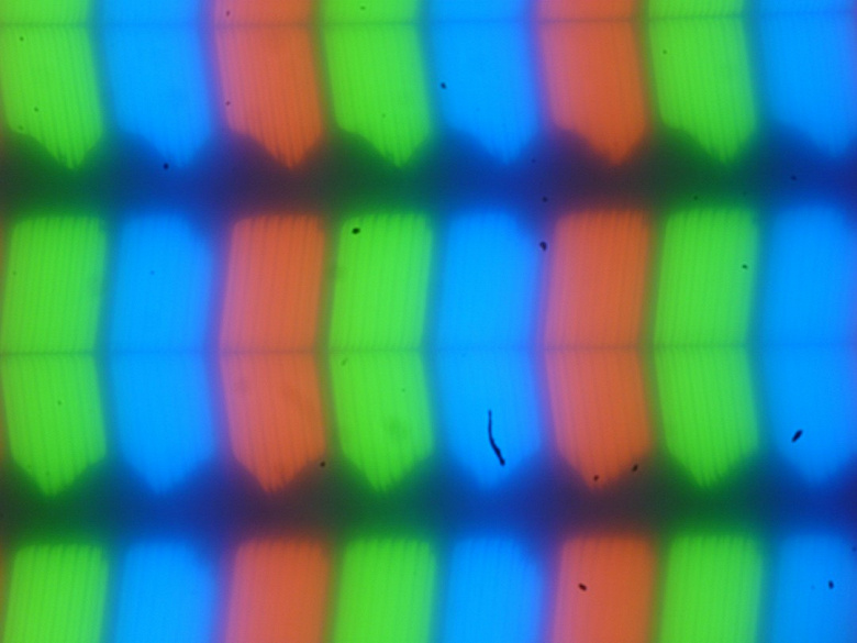 В этом ноутбуке используется матрица типа IPS. Микрофотографии демонстрируют типичную для IPS структуру субпикселей (черные точки — это пыль на матрице фотоаппарата):