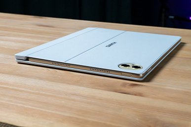 На торцах — по две сетки, за которыми скрывается суммарно восемь динамиков. А разъём у планшета один единственный — USB-C на одном из торцов.