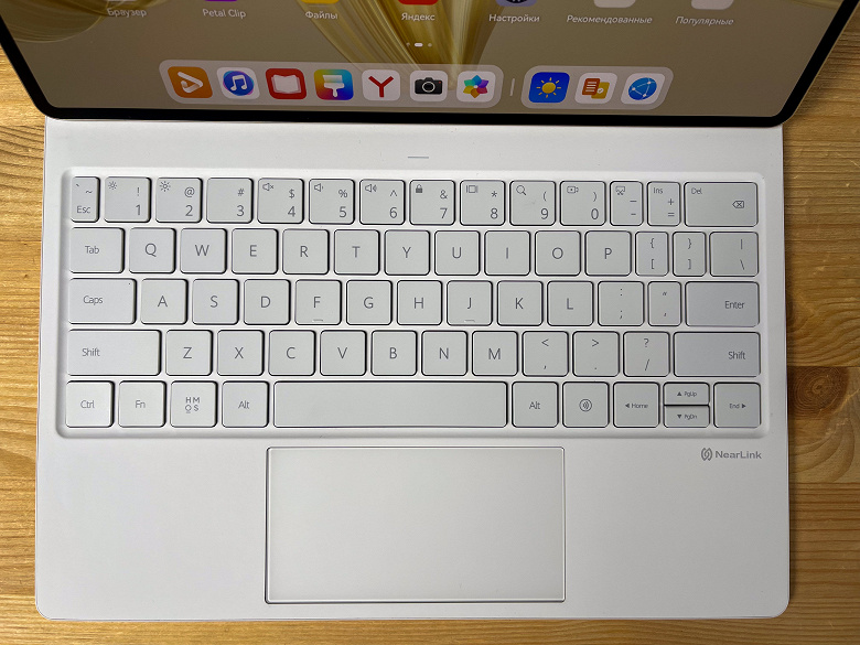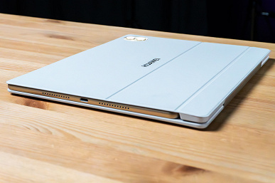 Чехол един, а не состоит из двух частей, как бывало у некоторых планшетов Huawei. Одна половина обложки примагничивается к задней панели планшета и держится на ней надежно, не отваливается и не съезжает. Открывается обложка, на мой взгляд, не очень удобно, не сразу понятно, какую из половинок тянуть, и иногда отсоединяешь задник. Возможно, это дело привычки. Интересно, что металлических контактов у чехла и планшета нет, связь с клавиатурой и, что важнее, её питание — бесконтактные.