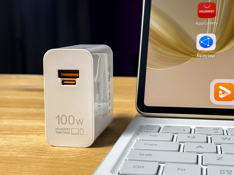 Батареи на 10100 мА·ч, как заявлено, должно хватать на 14 часов воспроизведения видео (правда, локального). А полностью заряжаться планшет должен за 55 минут, и это мы тоже проверим. Комплектная зарядка — 100-ваттная, причем с двумя разъёмами сразу: USB-C и USB-A, но расположены они так, чтобы их нельзя было использовать одновременно.