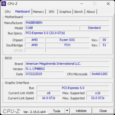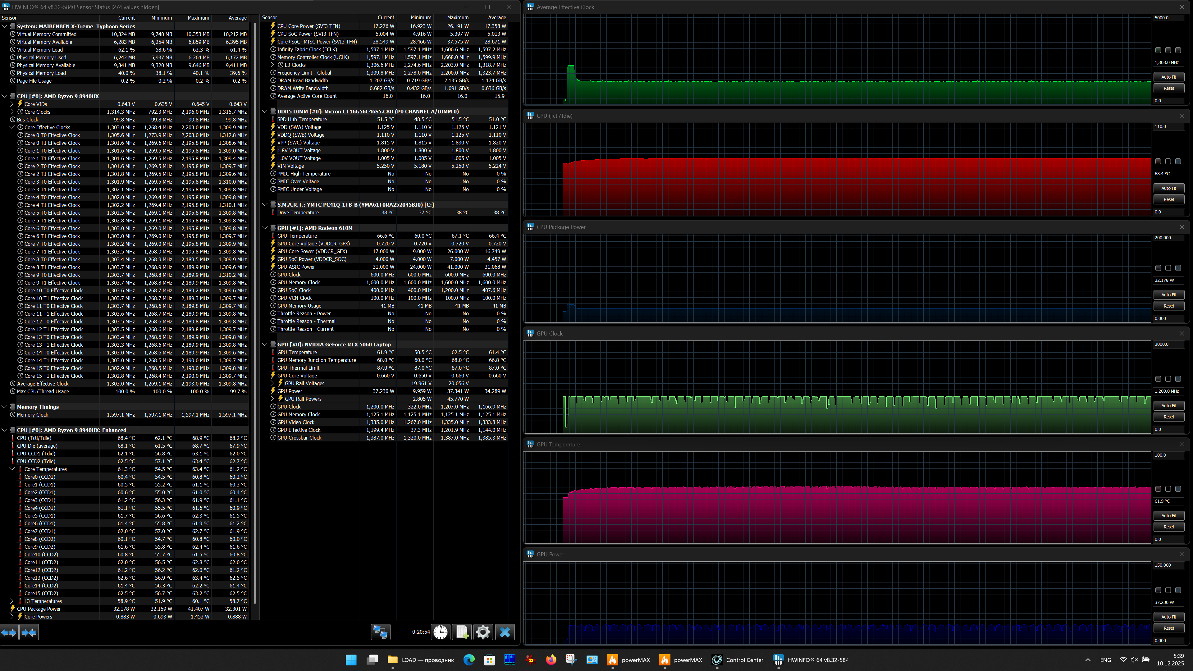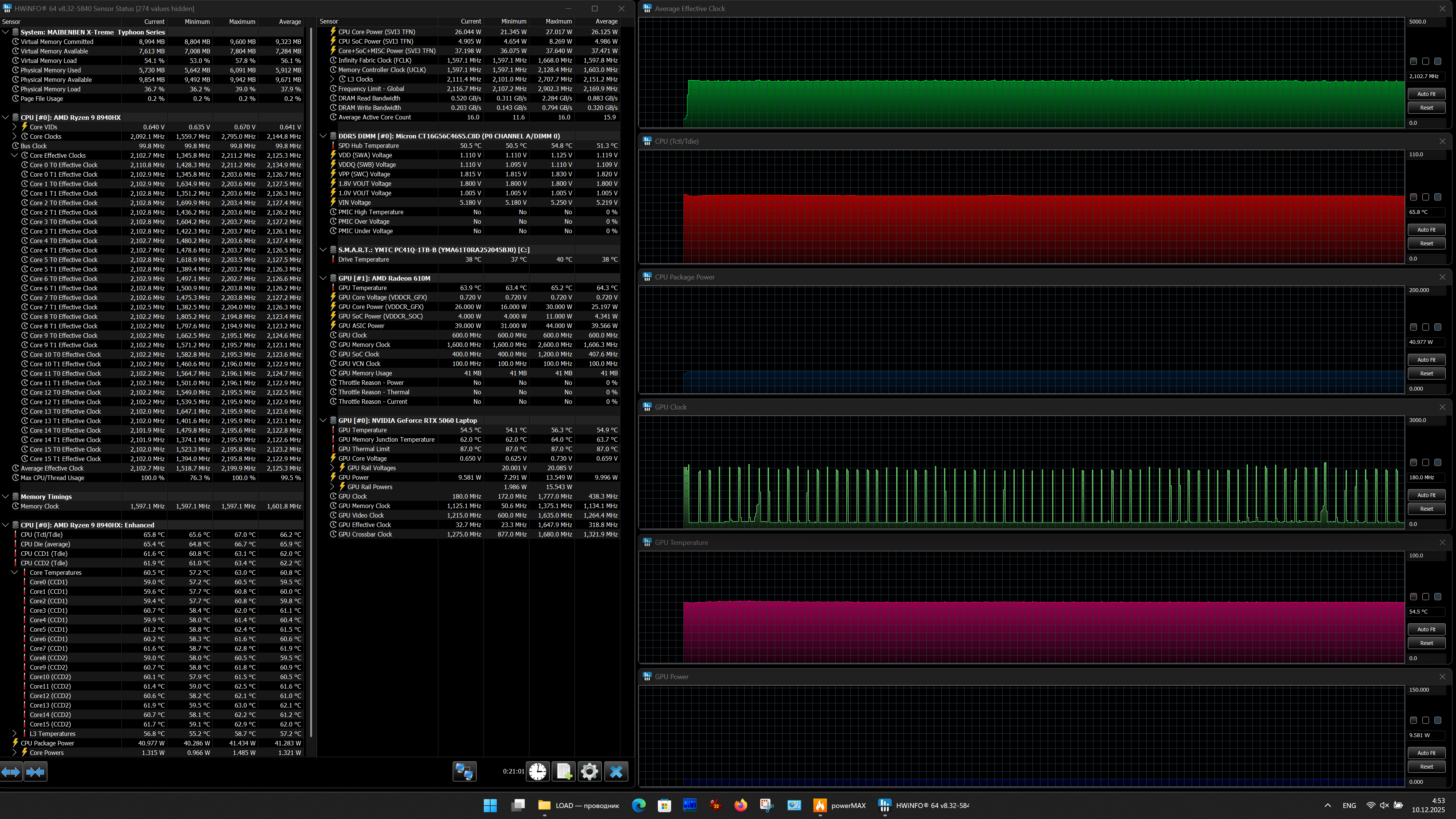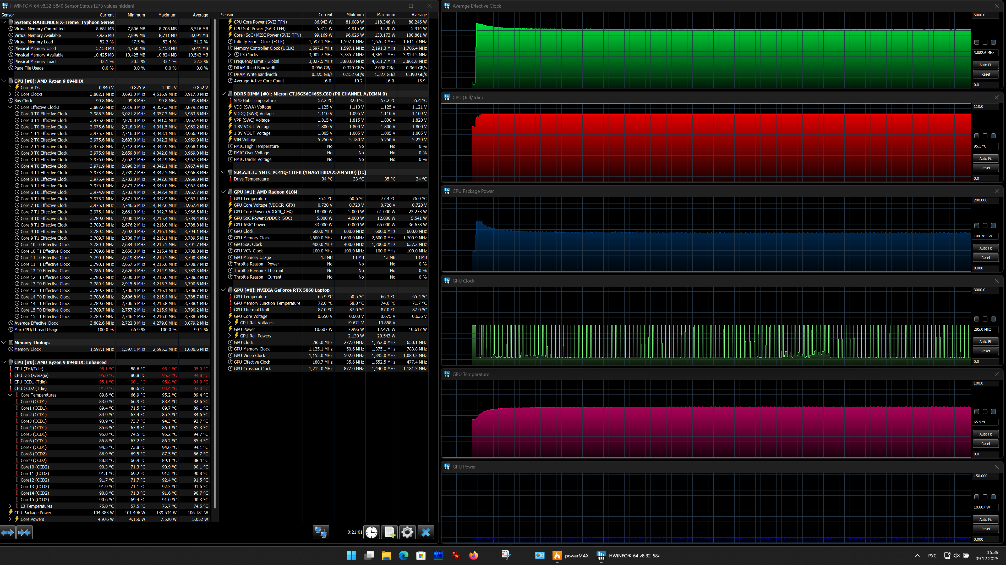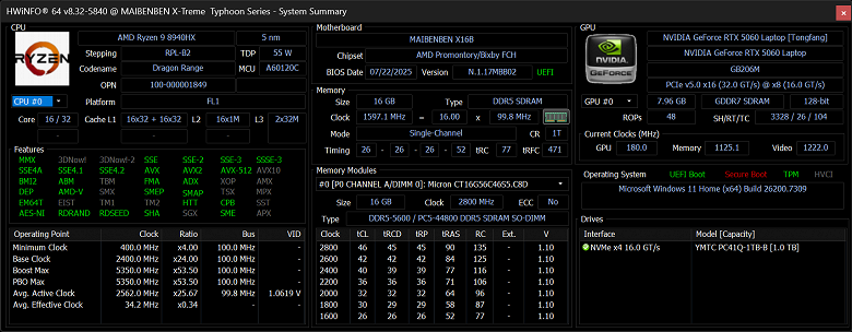 Аппаратная начинка ноутбука Maibenben X-Treme Typhoon X16B-R98956 объединяет новый субтоповый CPU AMD Ryzen 9 8940HX с видеокартой Nvidia GeForce RTX 5060 Laptop с 8 ГБ GDDR7 — решение вовсе не топовое, но зато доступное по цене. Оперативной памяти 16 ГБ — это не очень много, но для большинства игр достаточно. Возможности подключения периферии обеспечивают три порта USB 3.2 Gen1 Type A и два USB3.2 Gen2 Type С, оба последних поддерживают питание внешних устройств (PowerDelivery) и вывод видео (DisplayPort). Сверхскоростных Thunderbolt 4/5 или USB 4 нет. Имеются встроенный адаптер локальной сети Ethernet 2,5 Гбит/с и картовод для носителей SD/SDHC/SDXC.