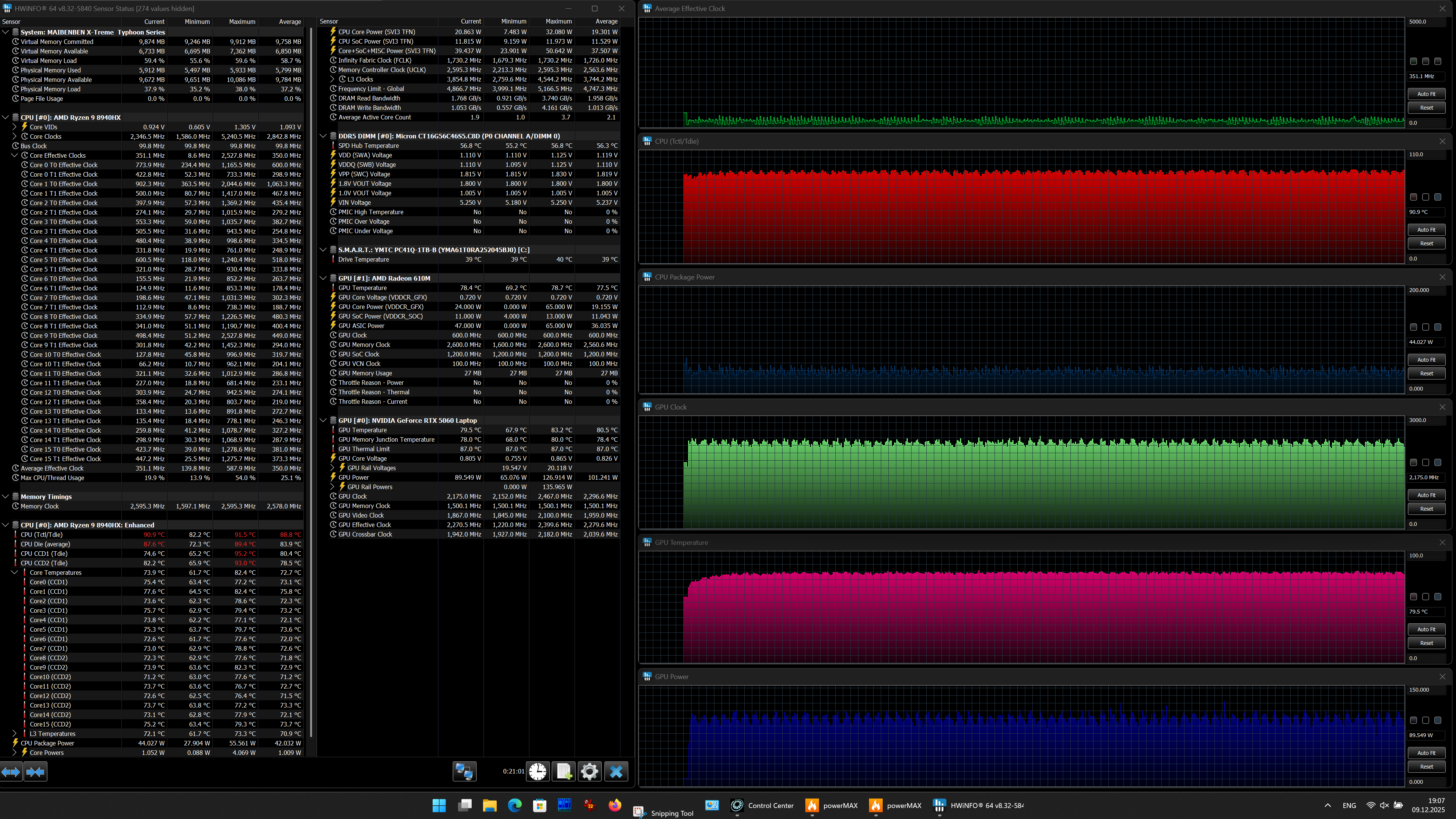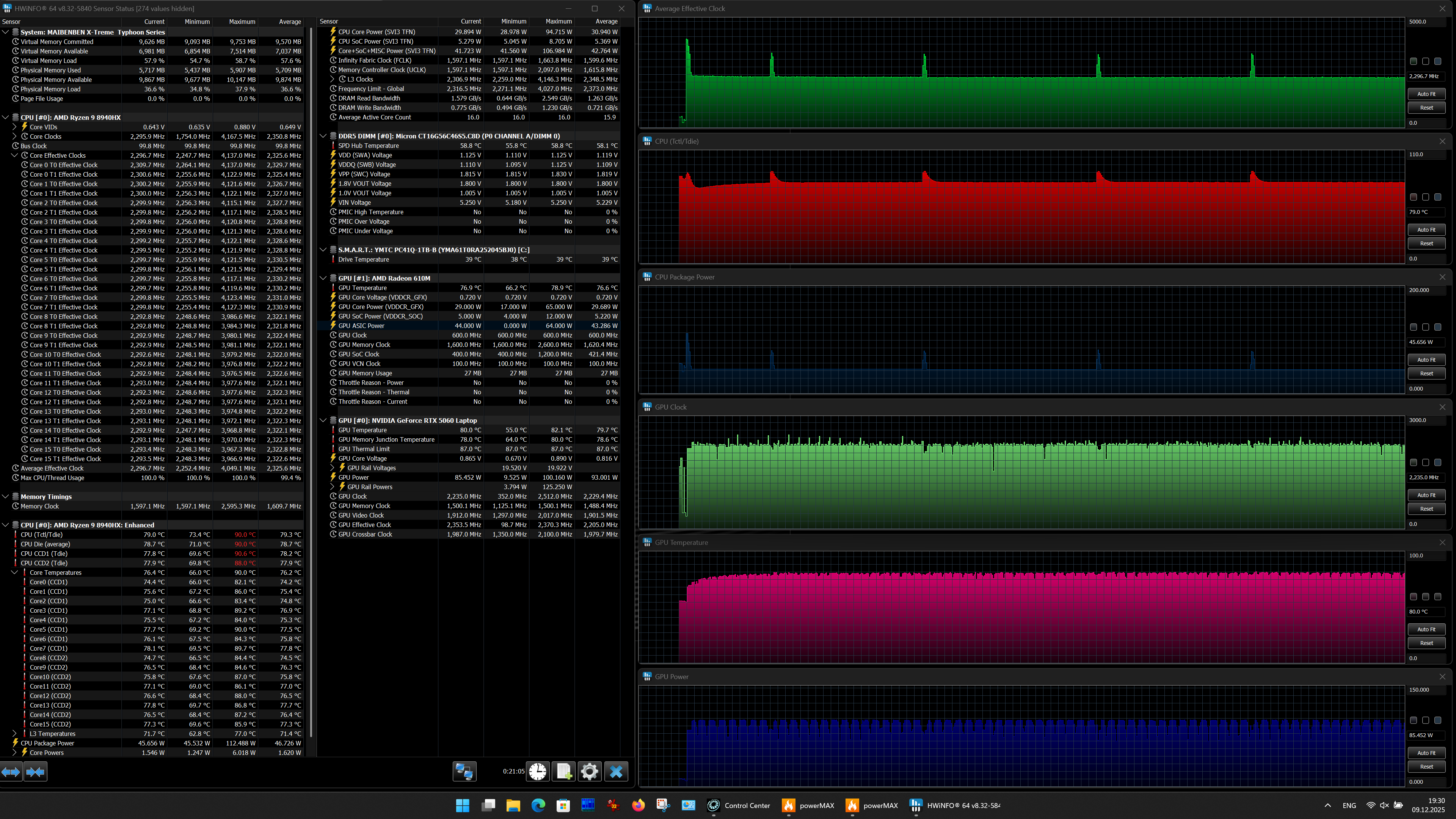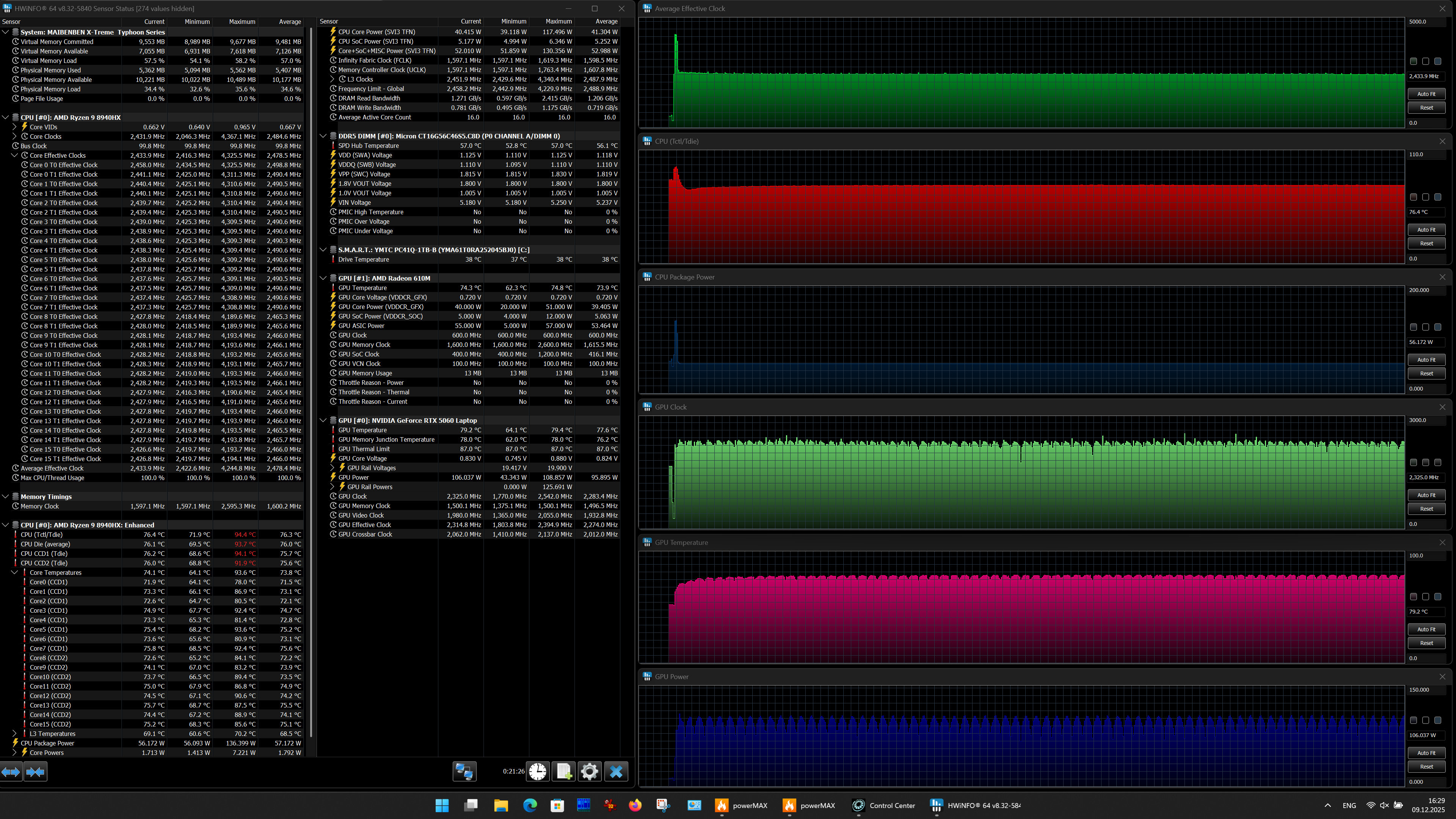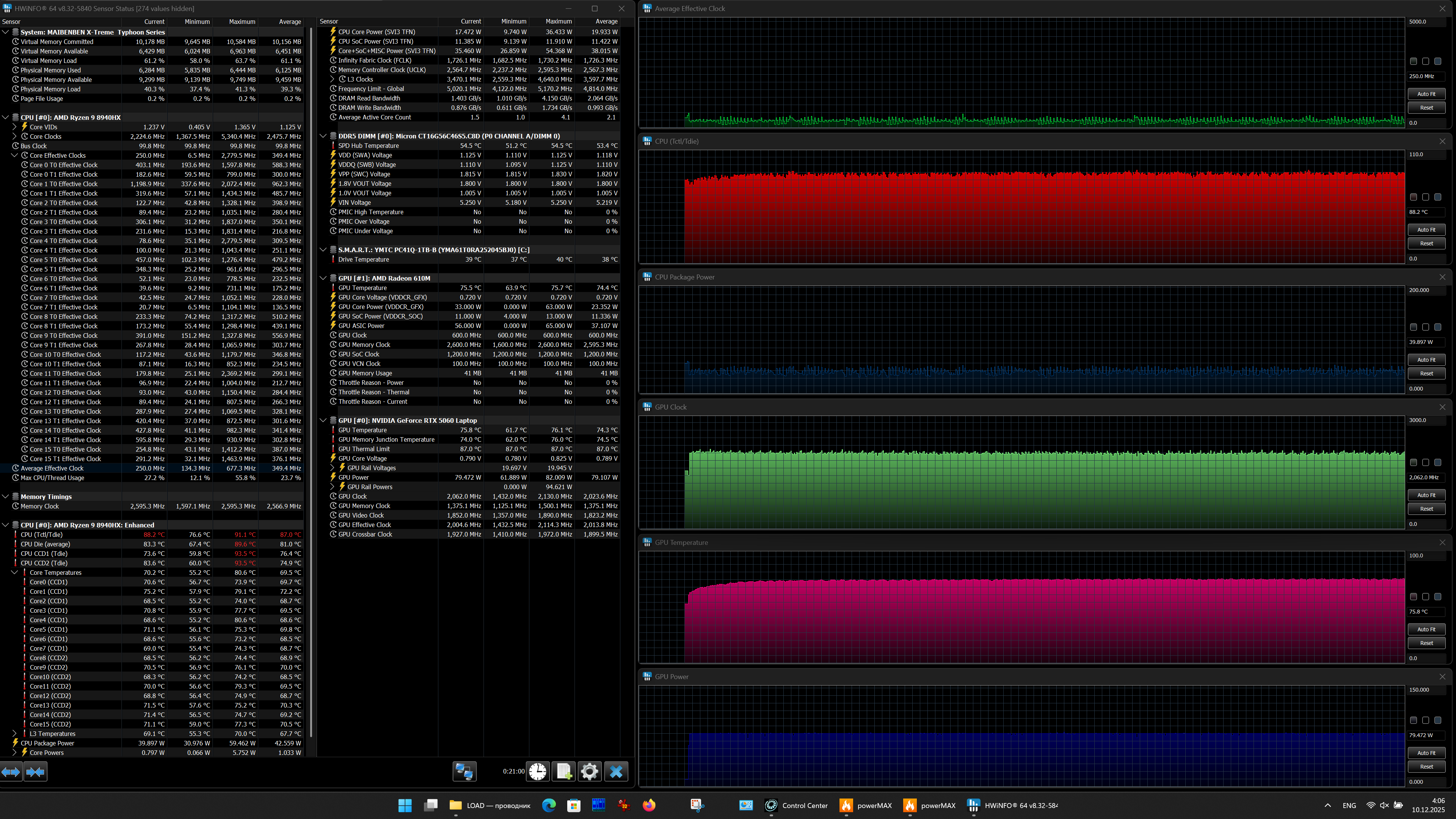 Аппаратная начинка ноутбука Maibenben X-Treme Typhoon X16B-R98956 объединяет новый субтоповый CPU AMD Ryzen 9 8940HX с видеокартой Nvidia GeForce RTX 5060 Laptop с 8 ГБ GDDR7 — решение вовсе не топовое, но зато доступное по цене. Оперативной памяти 16 ГБ — это не очень много, но для большинства игр достаточно. Возможности подключения периферии обеспечивают три порта USB 3.2 Gen1 Type A и два USB3.2 Gen2 Type С, оба последних поддерживают питание внешних устройств (PowerDelivery) и вывод видео (DisplayPort). Сверхскоростных Thunderbolt 4/5 или USB 4 нет. Имеются встроенный адаптер локальной сети Ethernet 2,5 Гбит/с и картовод для носителей SD/SDHC/SDXC.