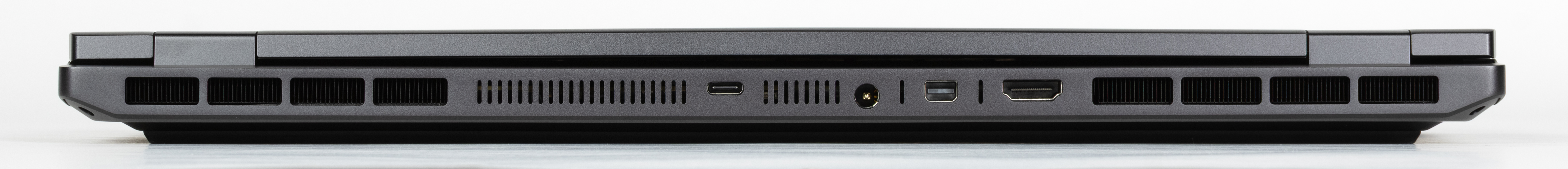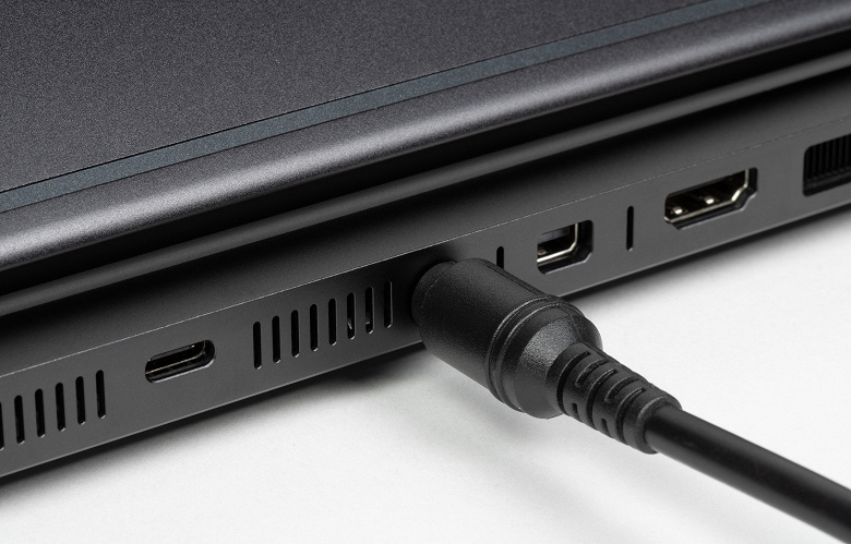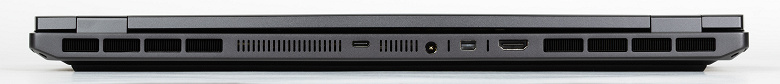 Сзади между правой и левой решетками выходных трактов системы охлаждения в ряд помещены порт USB 3.2 Gen2 Type-C, коаксиальный разъем для подключения адаптера питания, Mini-DisplayPort и видеовыход HDMI.