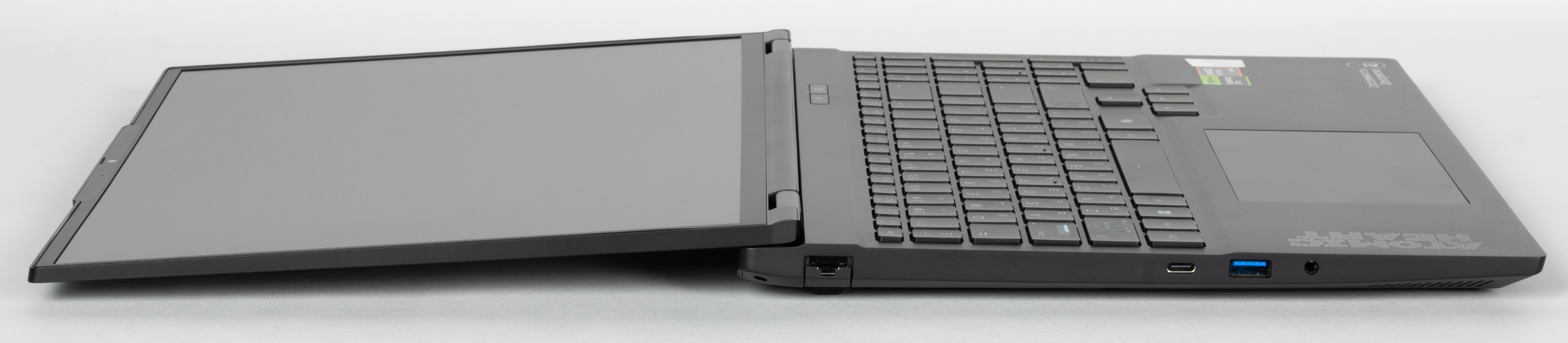 Ноутбук обладает большим 16-дюймовым экраном и соответствующими размерами и массой (свою весомую долю привносит еще и металл корпуса). Максимальный угол раскрытия более 180°. Благодаря этому в раскрытом виде крышка прилегает к столешнице по крайнем вере в ее верхней части. Ноутбук удерживается в закрытом состоянии при помощи петель, доводчиков и двух магнитов, скрытых под лицевой панелью у правого и левого передних углов. Устройство без особого труда раскрывается одной рукой, и корпус при этом срабатывает как противовес, вследствие чего ноутбук не сдвигается на столе.