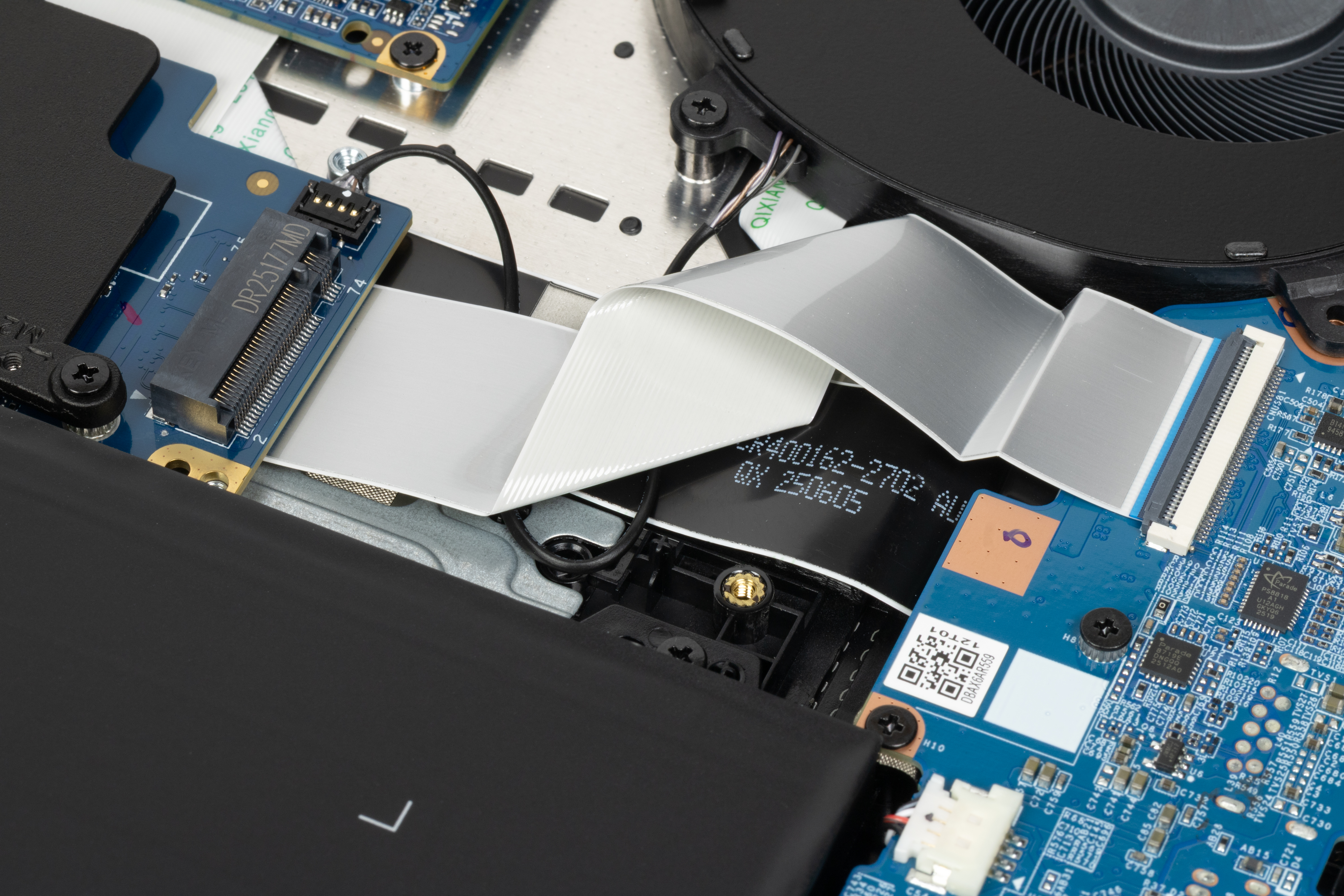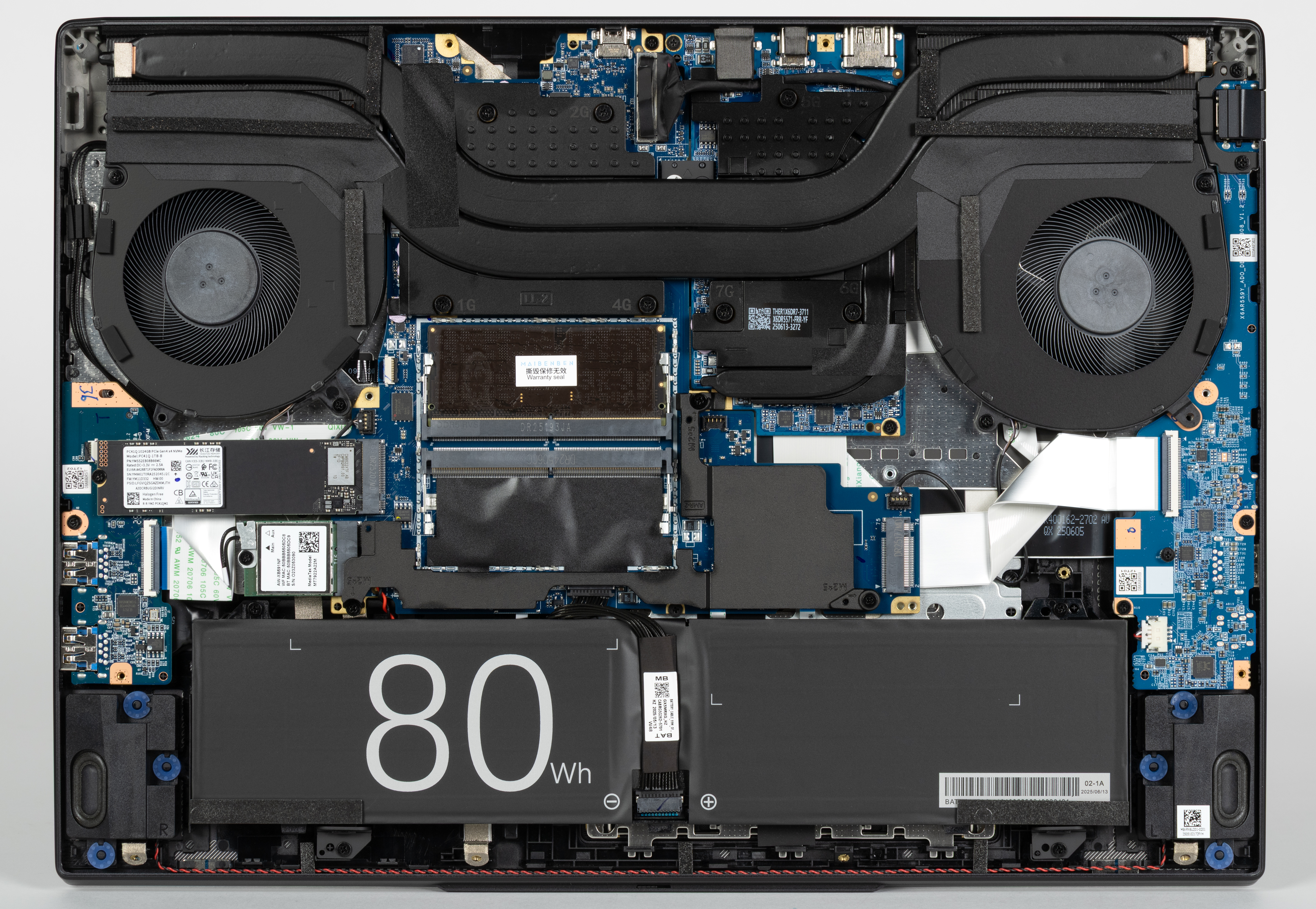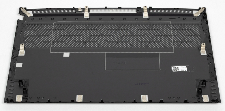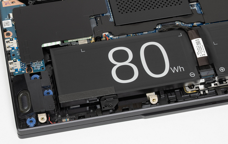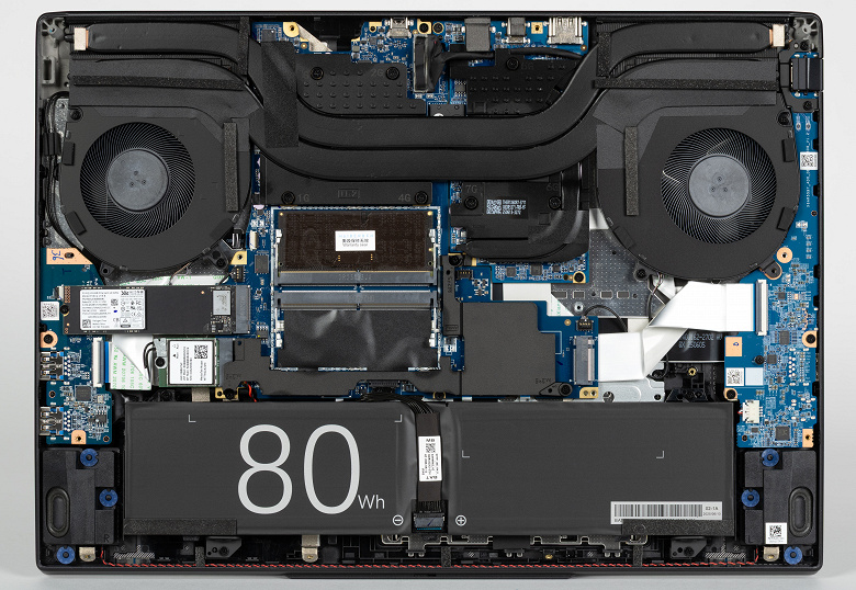 Наиболее объемными узлами внутри являются система охлаждения, аккумулятор, отсек для модулей оперативной памяти, прикрытый крышкой, и теплосъемные панели для накопителей, системного и дополнительного, которого нет в заводской комплектации.
