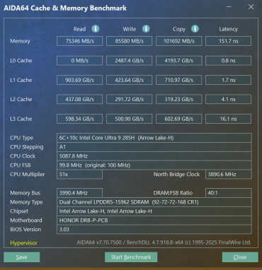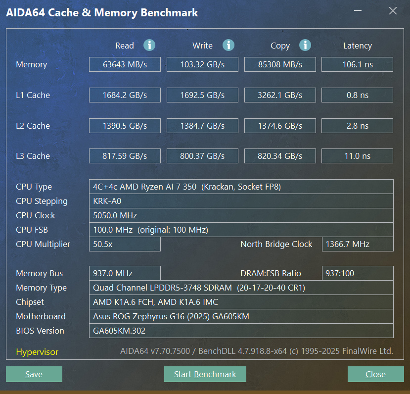 Здесь установлен 16-гигабайтный SO-DIMM Crucial/Micron. Таким образом, память работает в одноканальном режиме. Уточним ее скоростные показатели при помощи встроенного Cache&Memory Benchmark в приложении AIDA64.