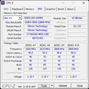 | Оперативная память | 16 ГБ DDR5-5600 в одном модуле Crucial CT16G56C46S5, одноканальный режим есть второй слот SO-DIMM, максимальный объем ОЗУ — 64 ГБ |
