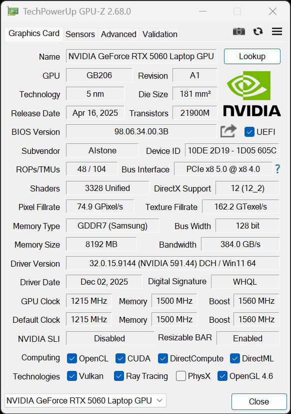 | Видеоподсистема | интегрированная: AMD c Graphics 610M (2 ядра, 2,2 ГГц) дискретная: Nvidia GeForce RTX 5060 Laptop с 8 ГБ GDDR7 (до 2,5 ГГц, 115 Вт) |