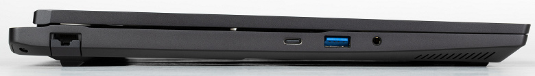 На левой боковой панели располагаются сетевая розетка RJ-45, второй USB 3.2 Gen2 Type C, USB 3.2 Gen2 Type А, а также комбинированный миниджек для подключения аудиогарнитуры.