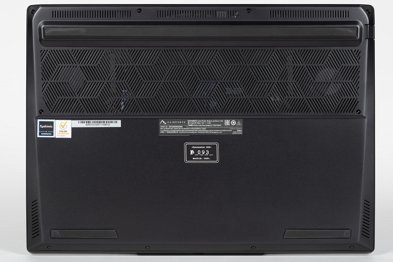 Рисунок решеток на днище причудлив. Входные отверстия для воздуха располагаются над кулерами и другими разогревающимися при работе элементами аппаратного оснащения. Задняя опора в виде линейки, две передних — скромные накладки из резины. В центре помещается ярлык с указанием трехзначного номера экземпляра. Как и обещано, все посчитано.